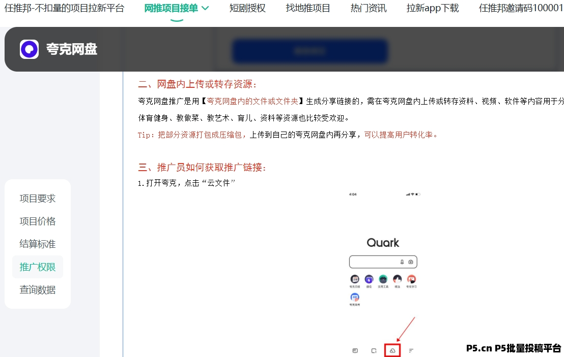 推荐使用任推邦平台,使用邀请码100001注册。任推邦作为夸克网盘的官方一级服务商,提供透明的拉新价格和详细的做单教程。
