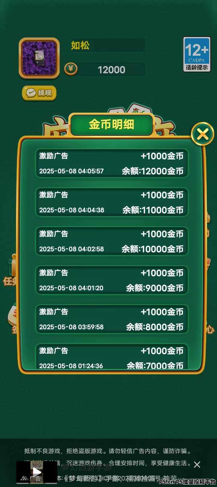 正文 麻了个麻,首码,看广告收益 jiejieliao0002262 V作者 /2025-05-09 08:38:33/683阅读 0509 麻了个麻,零撸看广告一个广告保底0.1元,不会少于0.1看一个广告休息5分钟再看下一个