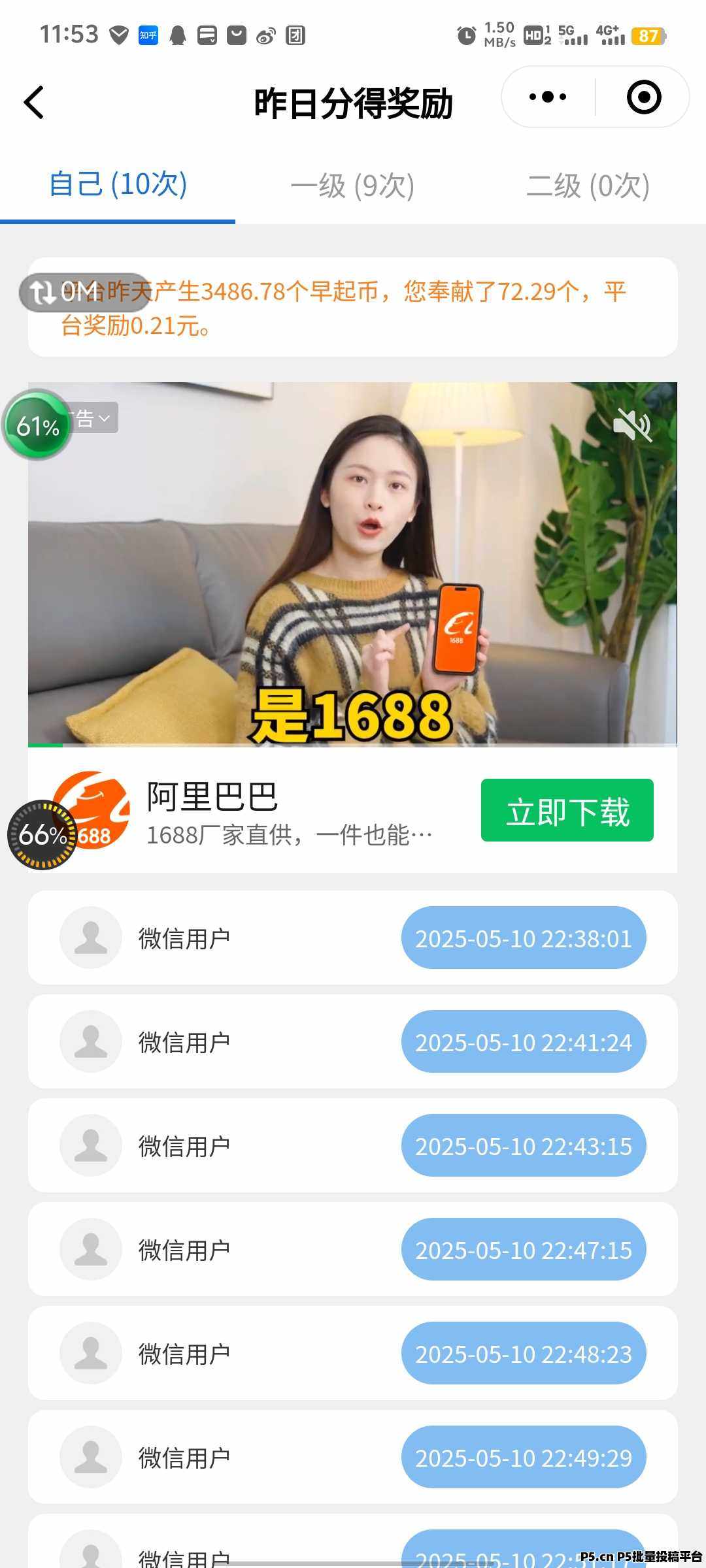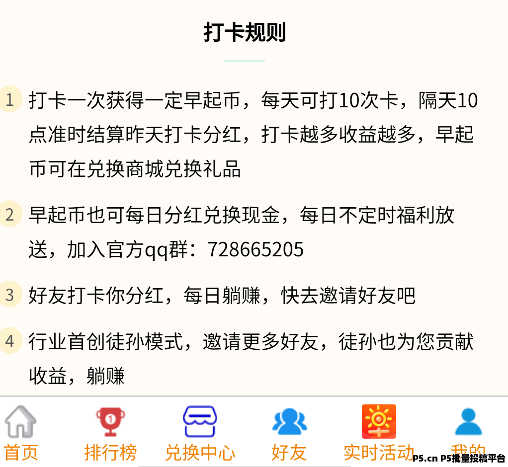 正文 早起打卡赚**,微信小程序操作简单! zhuzi123000612 V作者 /2025-05-12 12:32:37/744阅读 0512 早起打卡赚**每日完成十个广告打卡任务即可打卡获得的早起比每天上午十点左右**也可以兑换现金红包提现