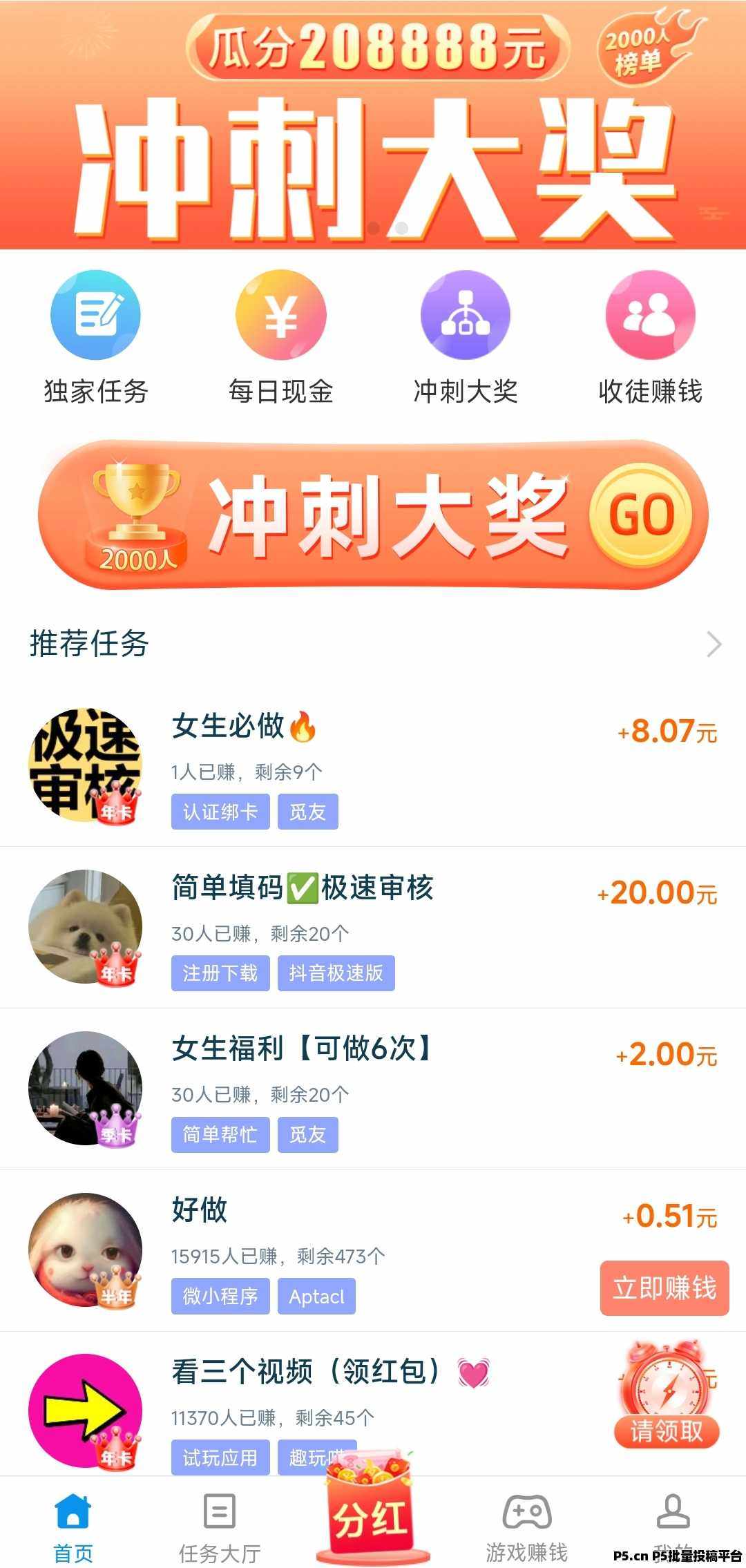 任务类型丰富:涵盖注册试玩、助力砍价、问卷调查、游戏试玩、电商推广等,单笔佣金最高可达几十元!