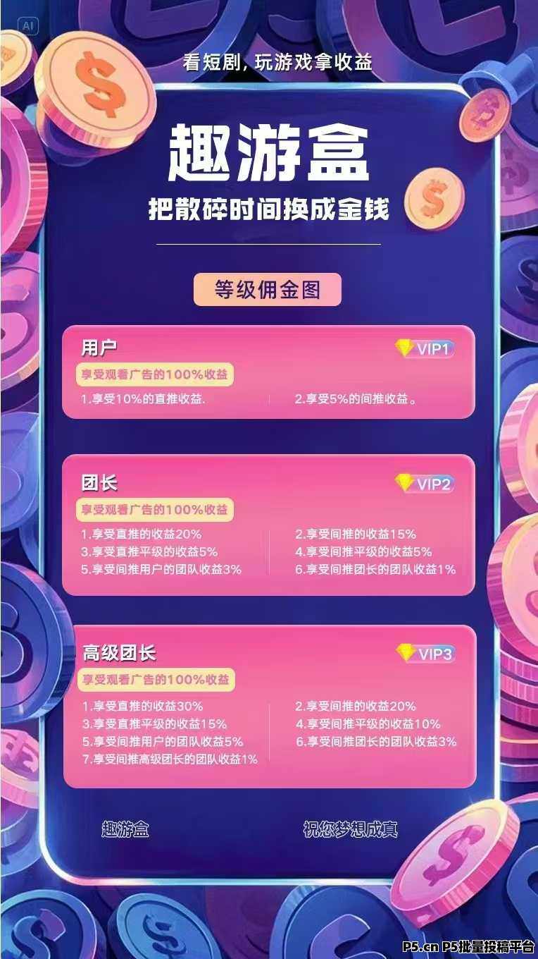 正文 趣游盒,首码项目 机你太美0002612 V作者 /2025-05-26 17:37:00/1.12 K阅读 0526 【趣游盒】5.26首码,首个集短剧,广告,游戏于一体赚米**。1.保底看普通广告,固定包不养机。2.每个游戏广告保底2元总共1万多个游戏。3.每部短剧看完保底4元还有叠包红包。推广2代收益+团队奖