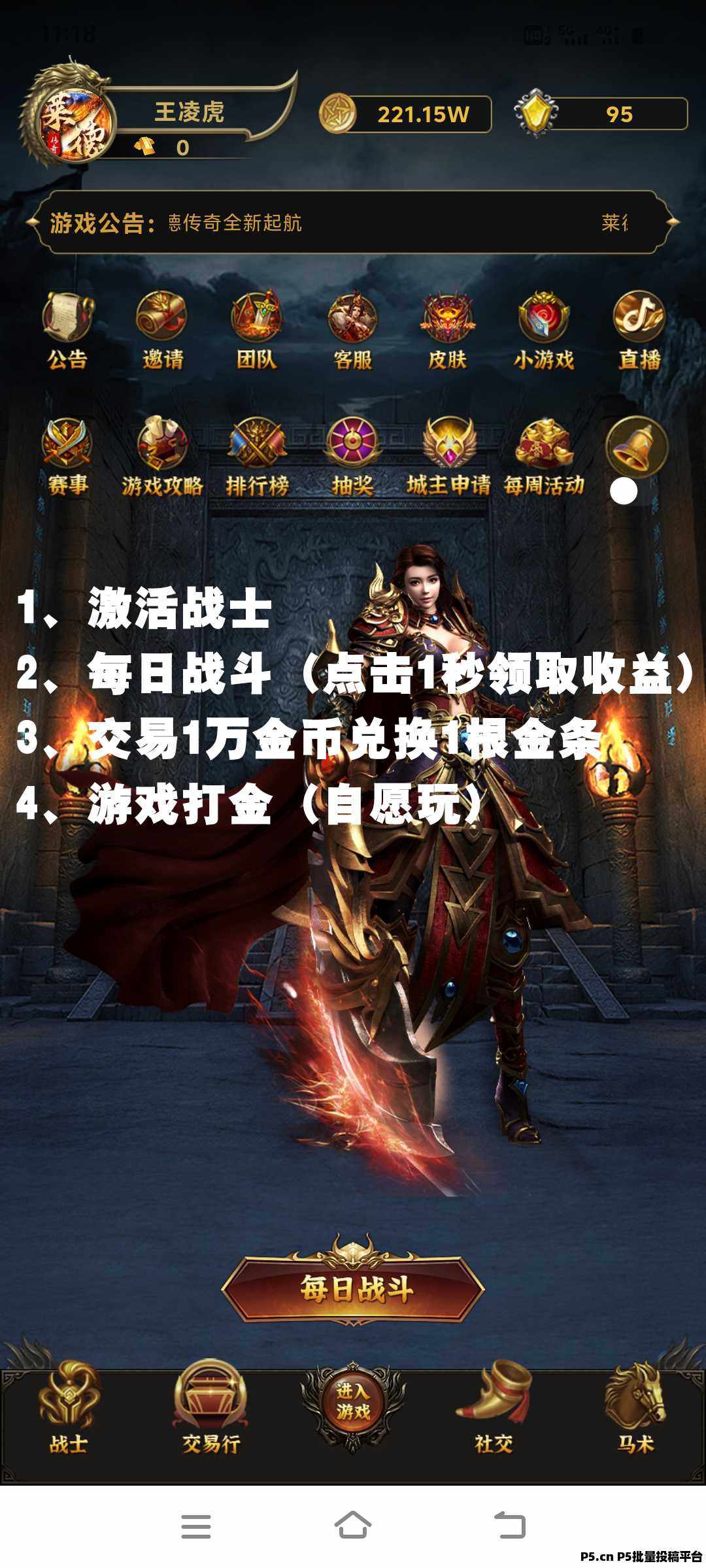 一、新人239开通战士人物(每天产8万金币产36天)每天点击战斗领取金币(1秒完成)