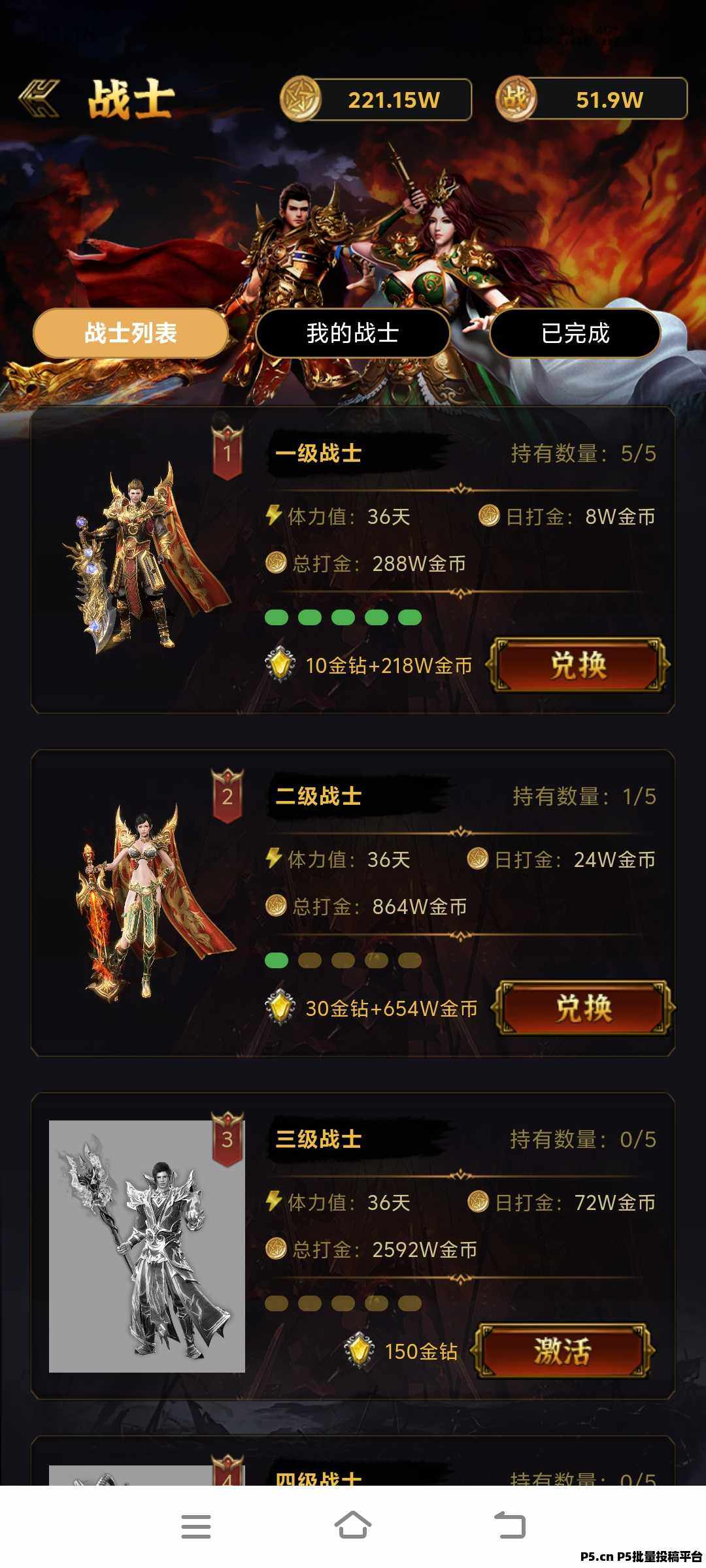 二、通过金钻10个+金币228万兑换下一级战士(每个战士体力值36天)