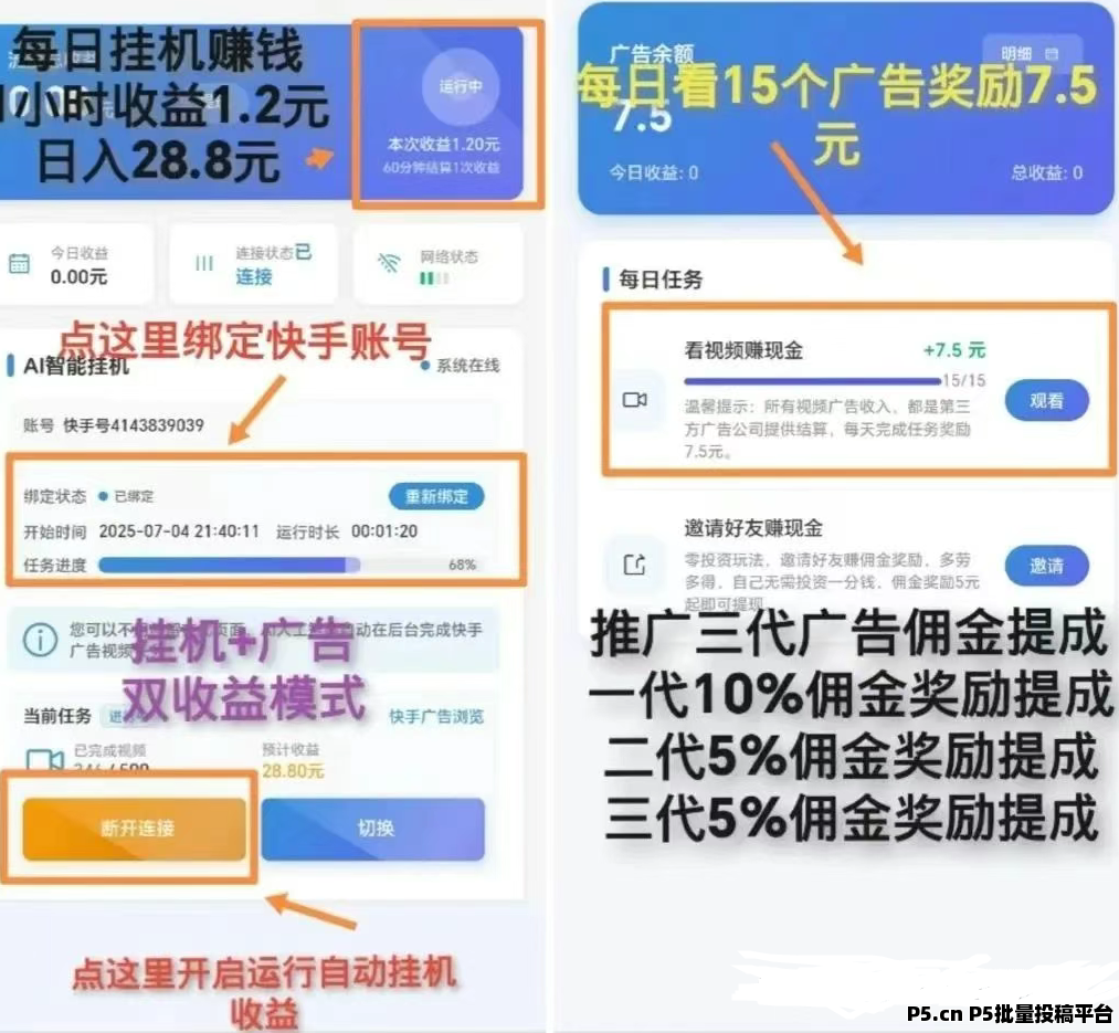**模式①:下载平台绑定你的快手号,打开自动操作功能,啥都不用管,快手托管帮你赚收益,一个月能拿864块