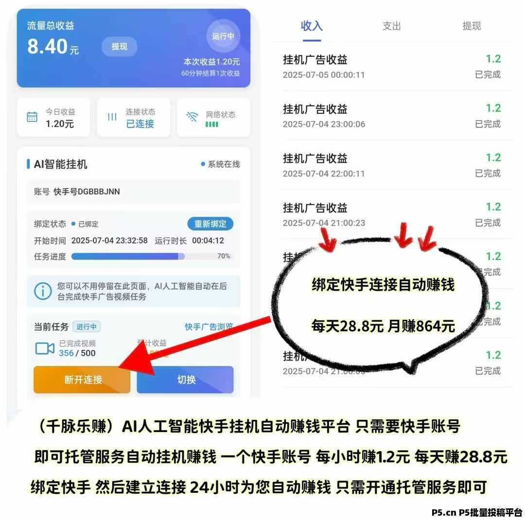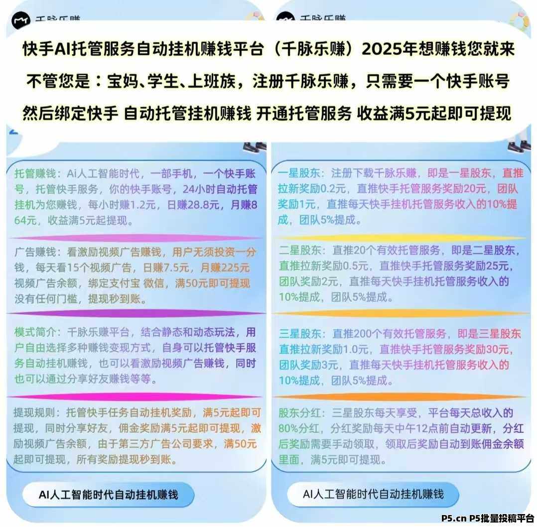 【千脉乐赚】快手自动挂机赚钱,一部手机,一个快手账号,托管快手服务,**挂机日赚28.8元,满5元起提现秒到账。