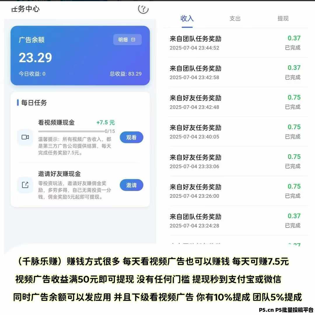 **赚钱②:看视频广告赚钱,零投资,每天看15个广告,日赚7.5元,月赚225元,广告余额,满50元即可提现,没有任何门槛。