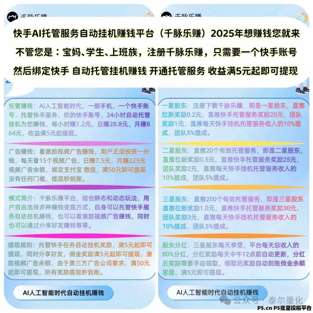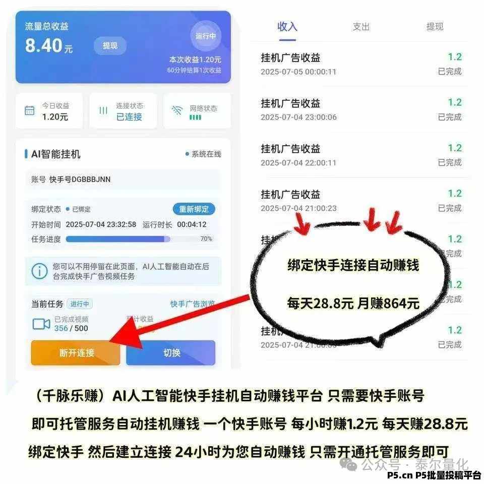 千脉乐赚:快手自动挂机赚钱,轻松月入864元,零投资高收益!