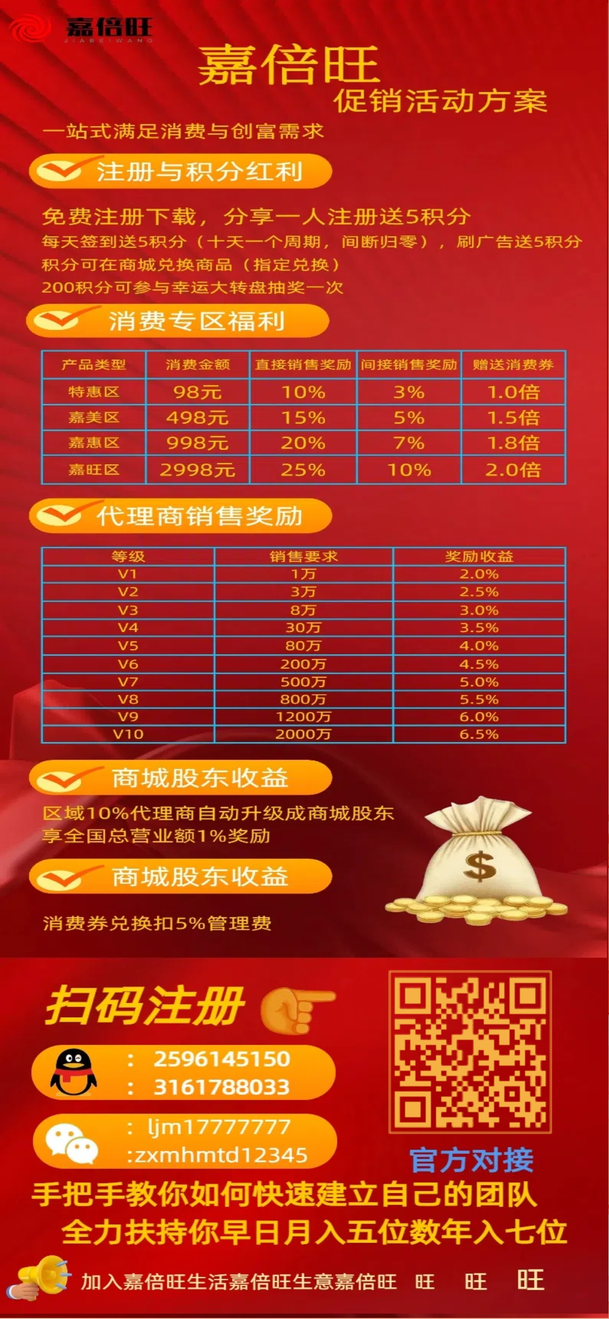 总结:我们不和那些暴利的ZJP比较,你说某某项目**十天二十天回本,一个月赚多少多少,我们不跟你抬杠,你说的对,但是我们做不到,银行都做不到,更何况我们一个商家,我们只想问它能做长久吗?它的高额利润从哪里来?你给它带来了什么价值,可以让它给你这么高的回报?我们的逻辑是时间换空间,消费者在我们平台消费,给我们平台一定的时间,让我们把你们花出去的钱返回到您的口袋,对于前期给我们平台创造价值的推广者,我们不会吝啬,会给到他们高额的回报,这就是为什么我们的**高的原因。所有的产品销售平台,在销售产品的同时都会有利润,例如淘宝、拼多多等。那是因为我们给您提供产品和服务了,今天我们加倍旺商城 愿意把这部分利润拿出来 分给那些为了推广我们商城平台 努力的推广者们!那些愿意相信我们商城的消费者,我们也不会辜负您的信任,给我们一定的时间,让我们的公司良性循环发展下去,您花的钱我们会双倍兑现,这才是一个企业真正的大格局,谋发展!