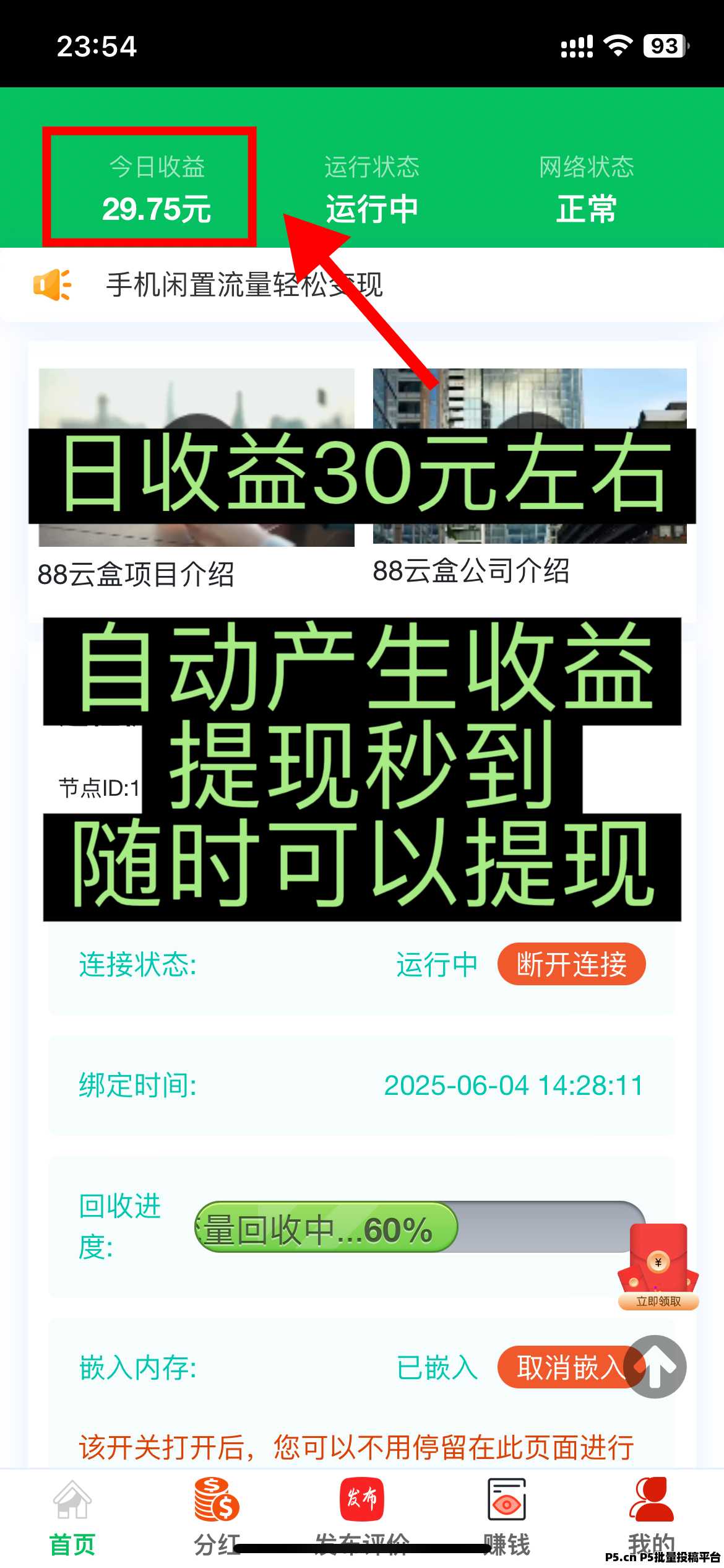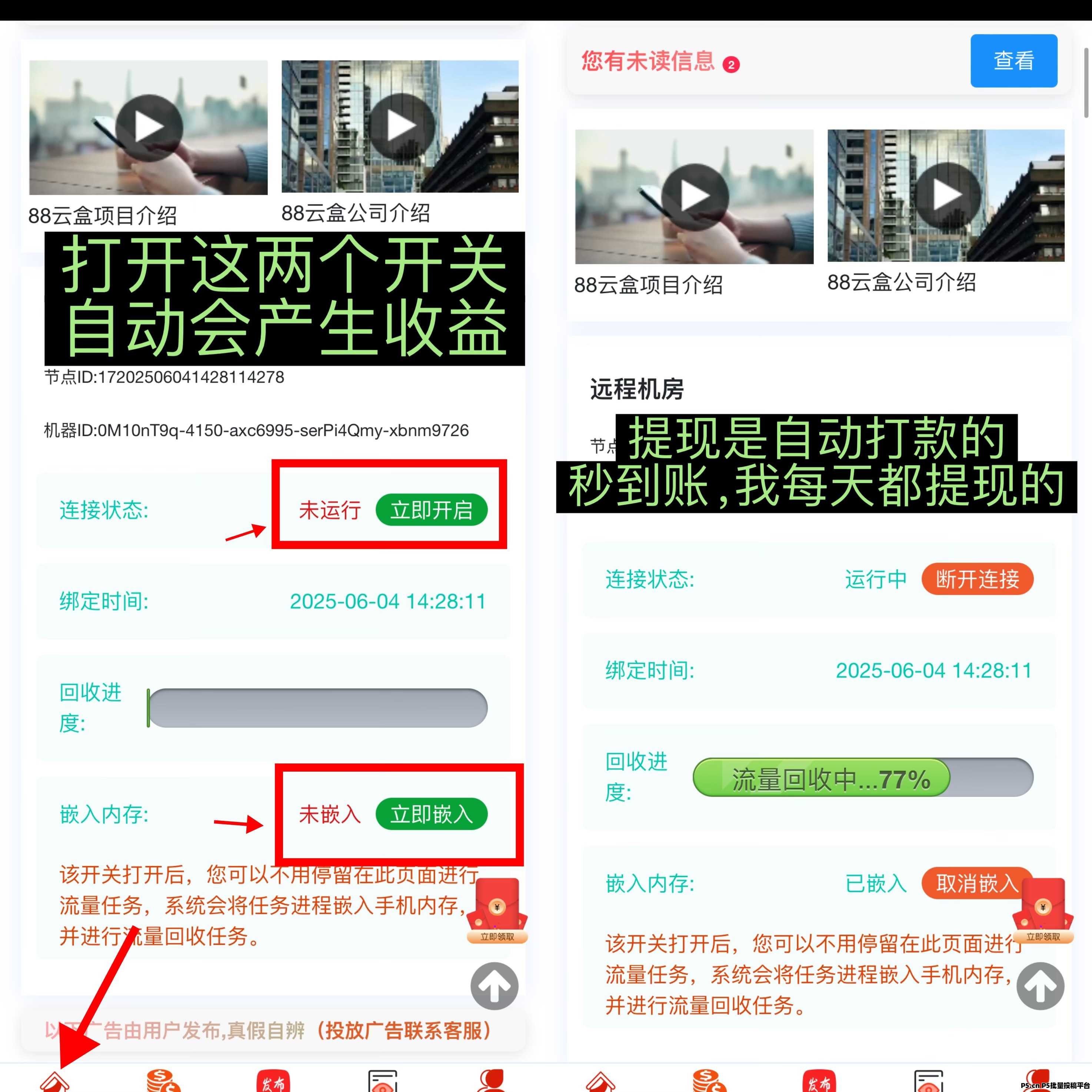 操作步骤:首页(左下角)进入app后,点启动运行, 3,立即嵌入。即可产生闲置流量回收收益,每小时结算一次•自动产生收益,不需要任何操作。