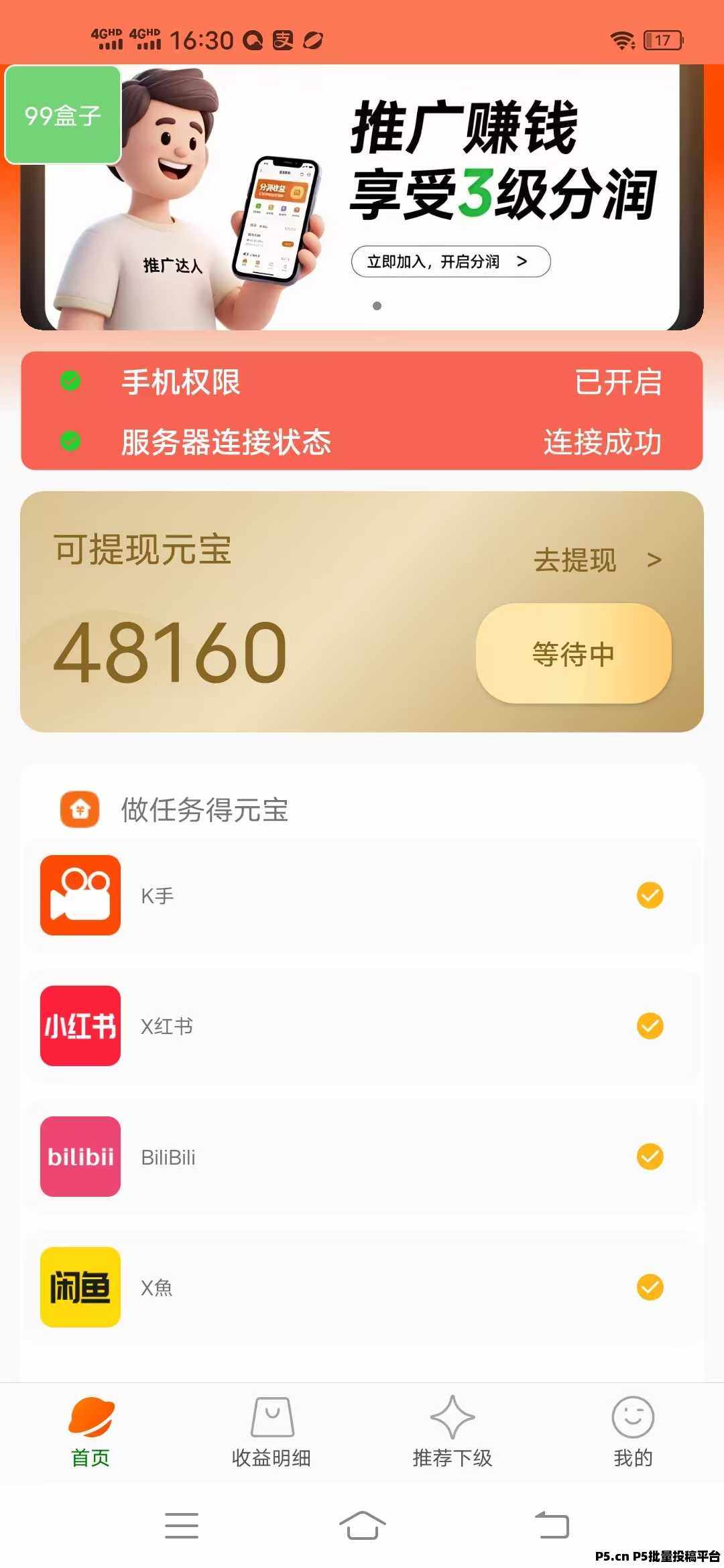 正文 99盒子多平台挂机,全自动运行,无需人工值守 menghu888000137 V作者 /2025-10-28 17:29:12/83阅读 1028 99盒子平台首码,单机一天10-20+可做平台:KS、小某书、某鱼、小破站任务无任何上车费用,三代裂变收益,抓紧上车,做第一批吃肉的人!另外,广告业务正在加急上线中,敬请期待!手机不断网不影响搬砖收益。简单设置自动开起来,其它不用管,无需要人工干预主要任务平台:X鱼、小破站、KS、某书,帮博主唰粉,点赞,播放量,绿色正规。利用工具来模似人工操作赚取佣金