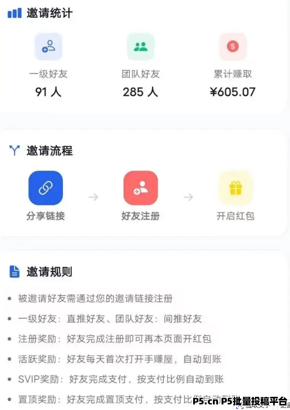 正文 【手赚屋】 0撸项目,找项目、发项目的好平台 rocky0003405 V作者 /2025-11-18 14:33:10/34阅读 1118 【手赚屋】正式上线,中国领先的手赚资源整合平台。发布项目/合作/资源不二之选。邀请好友政策:邀请好友开红包,注册即得。最低得1-2元,最高得3-5元。邀请好友活跃奖 固定一级0.2,团队0.1奖励红包拿到手软,尽在手赚屋。Szw管方首码直招一件接马拉新简单粗暴,不投入不石名不下载,单号80+空白市场好推广,裂变收益,能推广的基本都能日三位数,**+**双向收益,适合想做副业的朋友