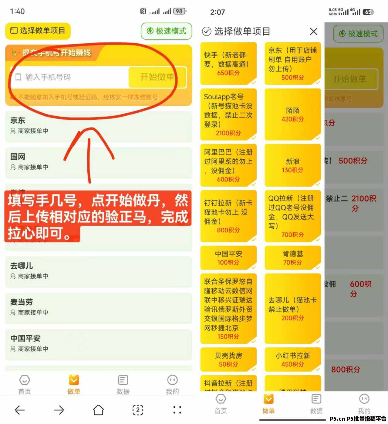 输入手机号,点击开始做单,手机收到验证码、上传验证码到对应的项目,最后提交,然后等待商家确认,佣金到账,步骤很简单,所以大大提高了推手的操作速度,不管是新手老手都能有不错的收入,商场周围,老年人活动中心周围等,都是适合的地推地点,因为老年机基本什么**都没注册过,所以可以获得单号最高收益。