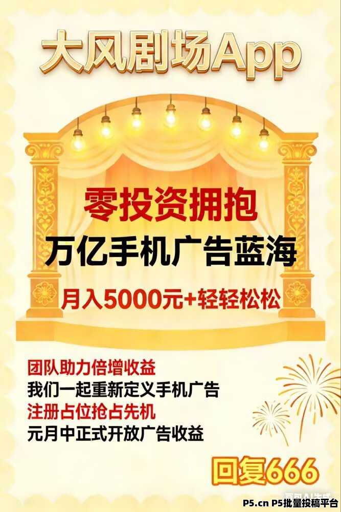 正文 大风剧场抢占手机广告蓝海 whl5350032620003558 V作者 /2026-01-07 12:44:28/63阅读 0107 大风剧场~零抢占万亿手机广告蓝海】大风剧场App是以短剧为载体看广告的平台。所有的用户免费参与,每看一条广告大约有15米价值的金币收益,一天最多可以看20条;团队助力将金币转换成现金收益,月入5000米+简简单单,推广给身边的朋友看,可轻松月入几万甚至更多,万亿蓝海,巨大风口,我们一起来重新定义手机广告!了解详情请入企鹅334639363