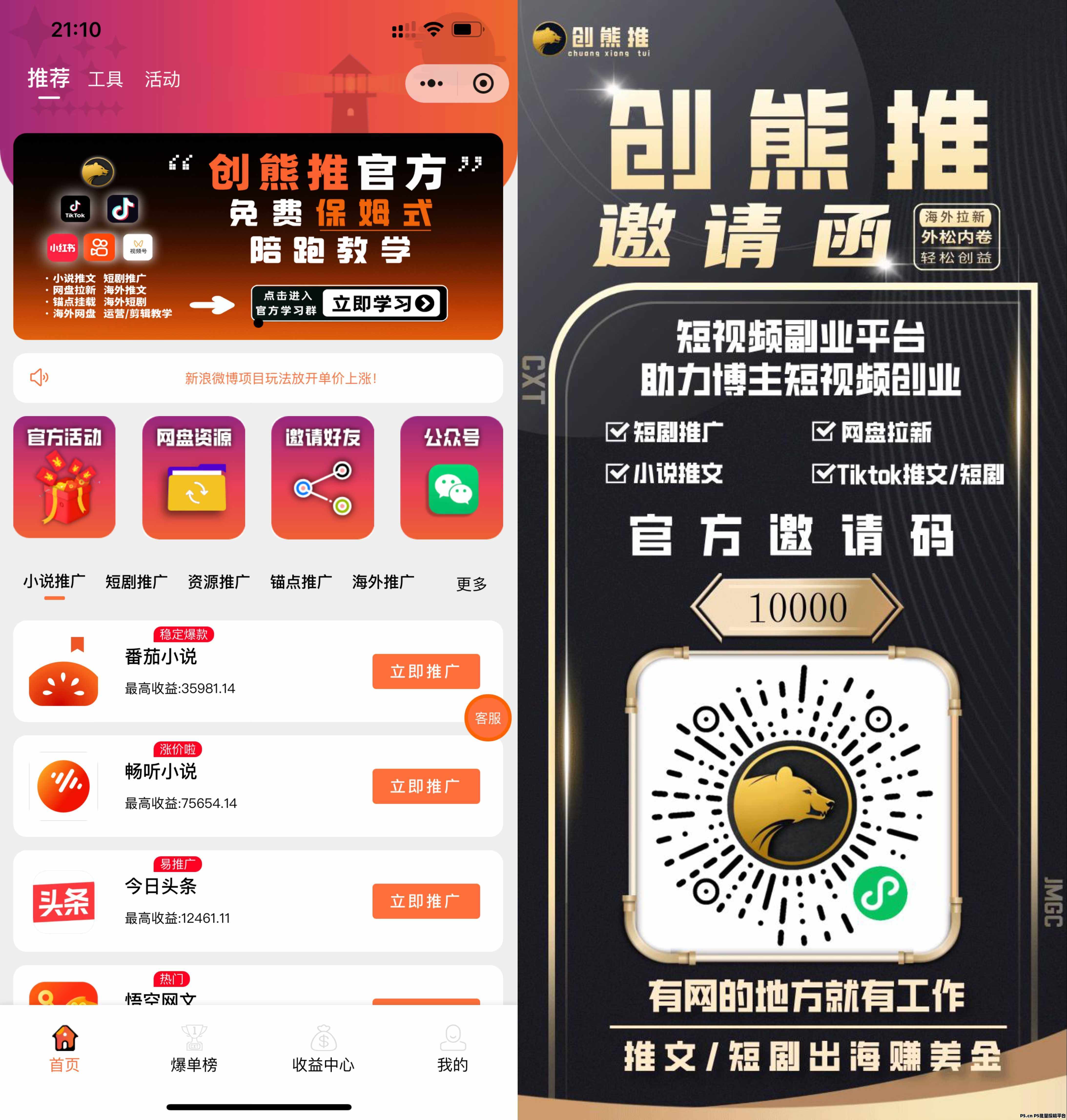 创熊推的出现,彻底解决了这些痛点!作为静眸工厂旗下深耕六年的互联网 APP 推广分发平台,官方邀请码:10000,不仅打通 “自媒体引流 — 项目对接 — 工具赋能 — 收益结算” 全生态闭环,更独家强化 AI 漫剧核心项目,搭配一级代理商资质、免费教学体系、高佣灵活结算,成为百万达人的变现首选。无论是零基础小白,还是想放大收益的自媒体老手、团队团长,都能在这里抢占 AI 漫剧新风口,实现 “推广即赚钱” 的目标!