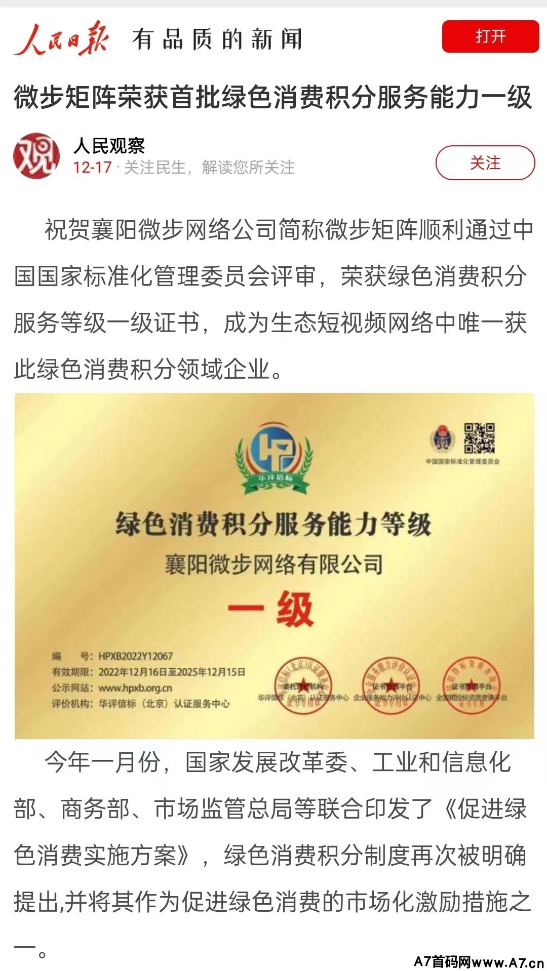 首码才出微步矩阵,免费认证,不扫脸,襄阳微步网络公司简称微步矩阵顺利通过中国**标准化管理委员会评审,荣获绿色消费积分服务等级一级证书,成为生态短视频网络中唯一获此绿色消费积分领域企业。