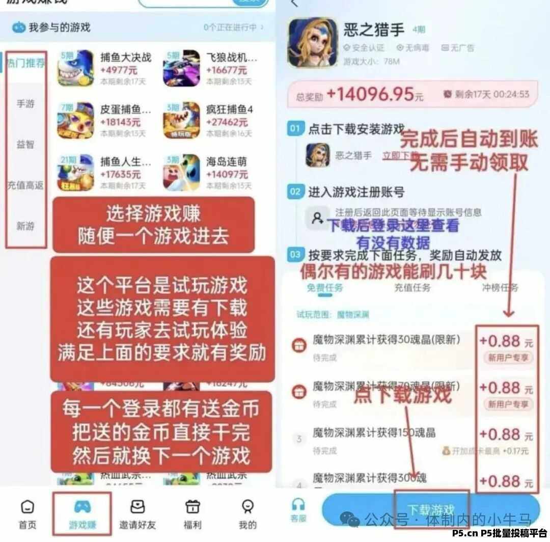正文 手游赚:自动挂机试玩游戏赚钱 yimeng000148 V作者 /2026-02-06 08:59:13/55阅读 0206 手游赚是一个游戏试玩赚钱的平台,但是里面很多游戏都可以自动挂机玩,我自己亲测挂10分钟2-5块钱收益,满10元就能提现。操作流程1、微信扫码注册下载app,下不了就保存图片浏览器打开,安卓苹果都能玩2、进入随便先平台玩就行,比如消消乐这种类型的,打到多少关多少钱这种最好,里面大部分游戏都有自动挂机按钮,挂着就行。没金币了就还其他的玩。是我下级我都会赠送白银卡,做任务收益会提升一些