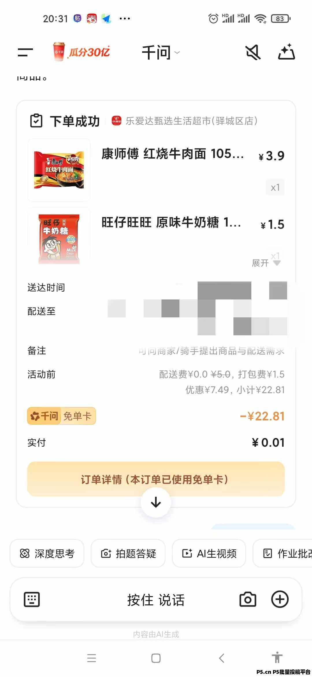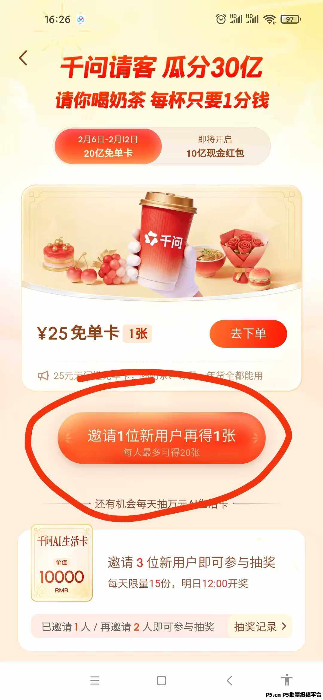 正文 千问免单卡,也可以咸鱼出售 liu19890003533 V作者 /2026-02-08 18:01:15/58阅读 0208 今年千问发了30亿红包,而且是阿里旗下很强大的Ai**,可以用来工作学习使用,很方便。先下载app,不要注册登录,下载安装后复制下面内容到app或者扫二维码即可,必得25元无门槛免单卡,而且邀请一个人也必得25元免单卡,可用于奶茶、外卖、商超等,很实惠,默认是奶茶,可以选择外卖或商超,除夕分10亿。以下是口令:领25元免单卡,奶茶零食订单都能用!!7eab3Fw7Ou!复制口令,去打开一个回答聪明会办事还有免单卡点奶茶的app