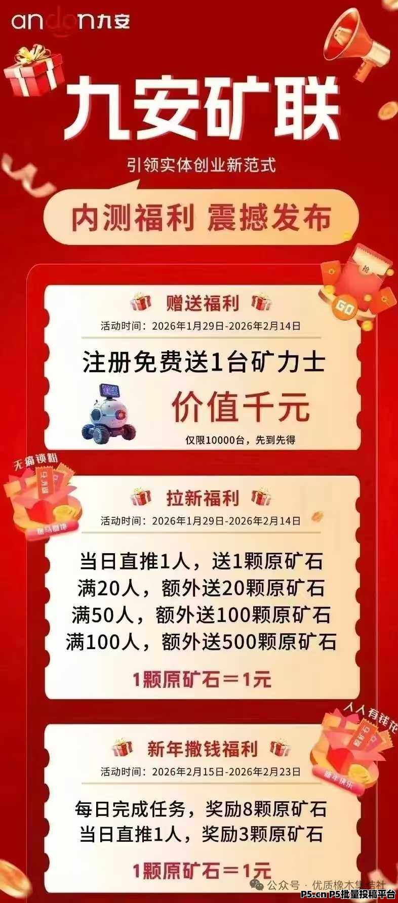正文 久安平台,绿色长久,过年不放假,可撸可投,每天变米 店流宝000160 V作者 /2026-02-14 09:57:36/541阅读 0214 首码九安矿联撸投最后二天送矿机,没玩的赶紧上第一个方案:每天看三个广告领取个矿机,看35天一次性领取500个币第二个方案:花500米购买一个500的矿机,兑换之后每天可以一键领取收益,每天中午12点还有广告约60米重点就是每天都能卖,回本很快没有任何手续费,内转给我都在收干不干一句,剩下的我帮你安排!收货热度非常高,要参与的尽快上车,零撸月收入高达一千零撸的话35天可以得到1000块左右服务V:jindoumangguo