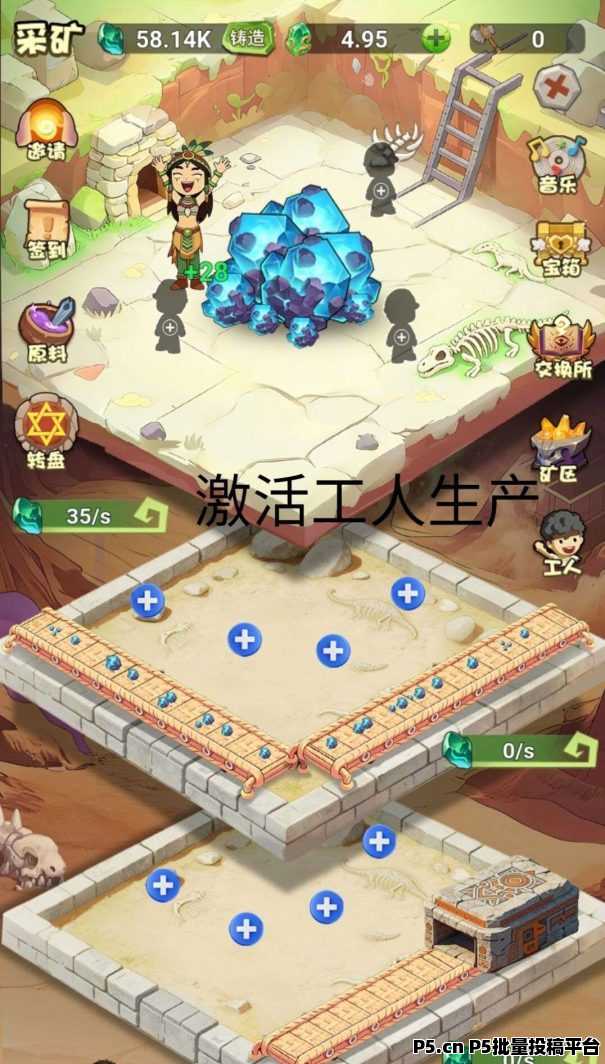 游戏设有三条生产线,每条线需要不同的工人。通过消耗工人碎片和斧头可以提升工人等级,大幅提高生产效率。工人安排完毕后,每日通过看广告补充原料,工厂自动生产旷石