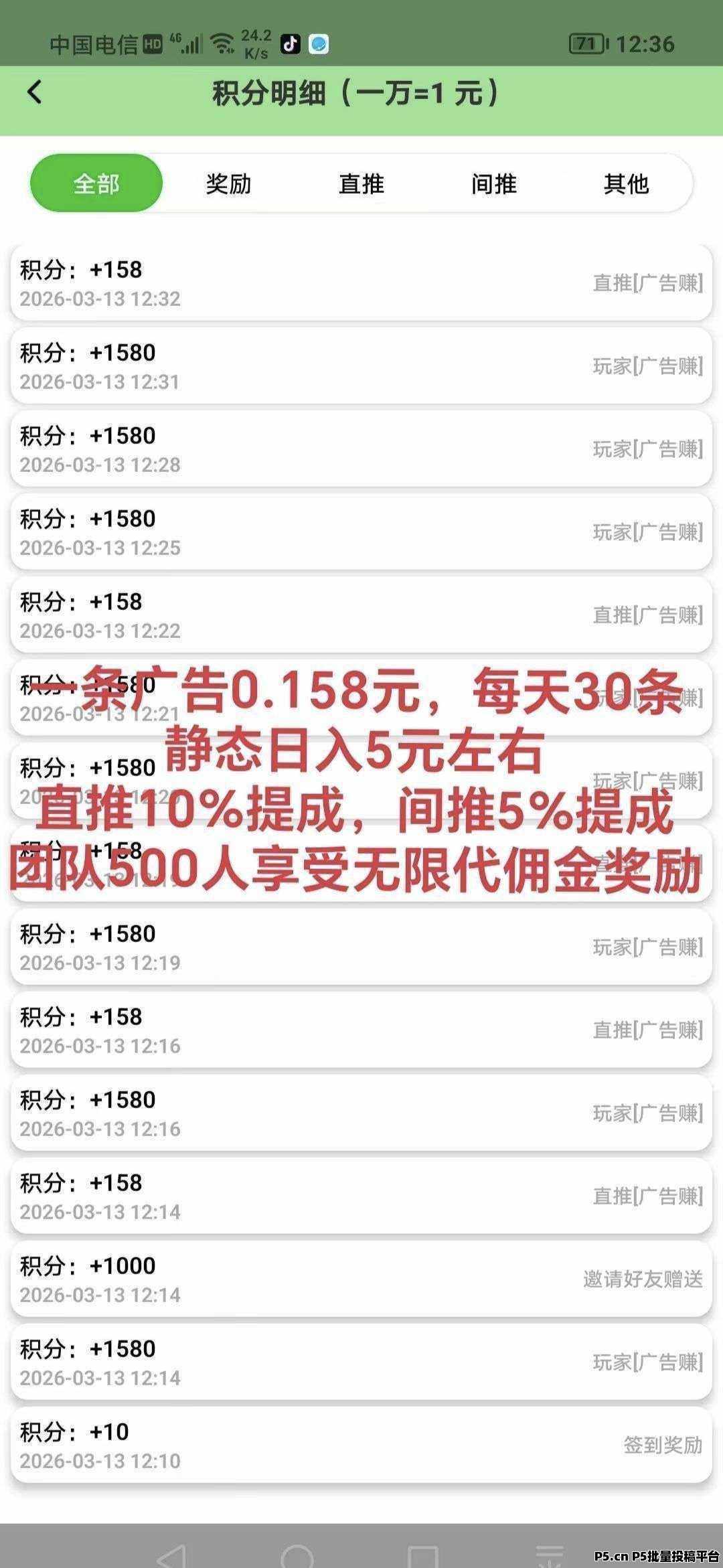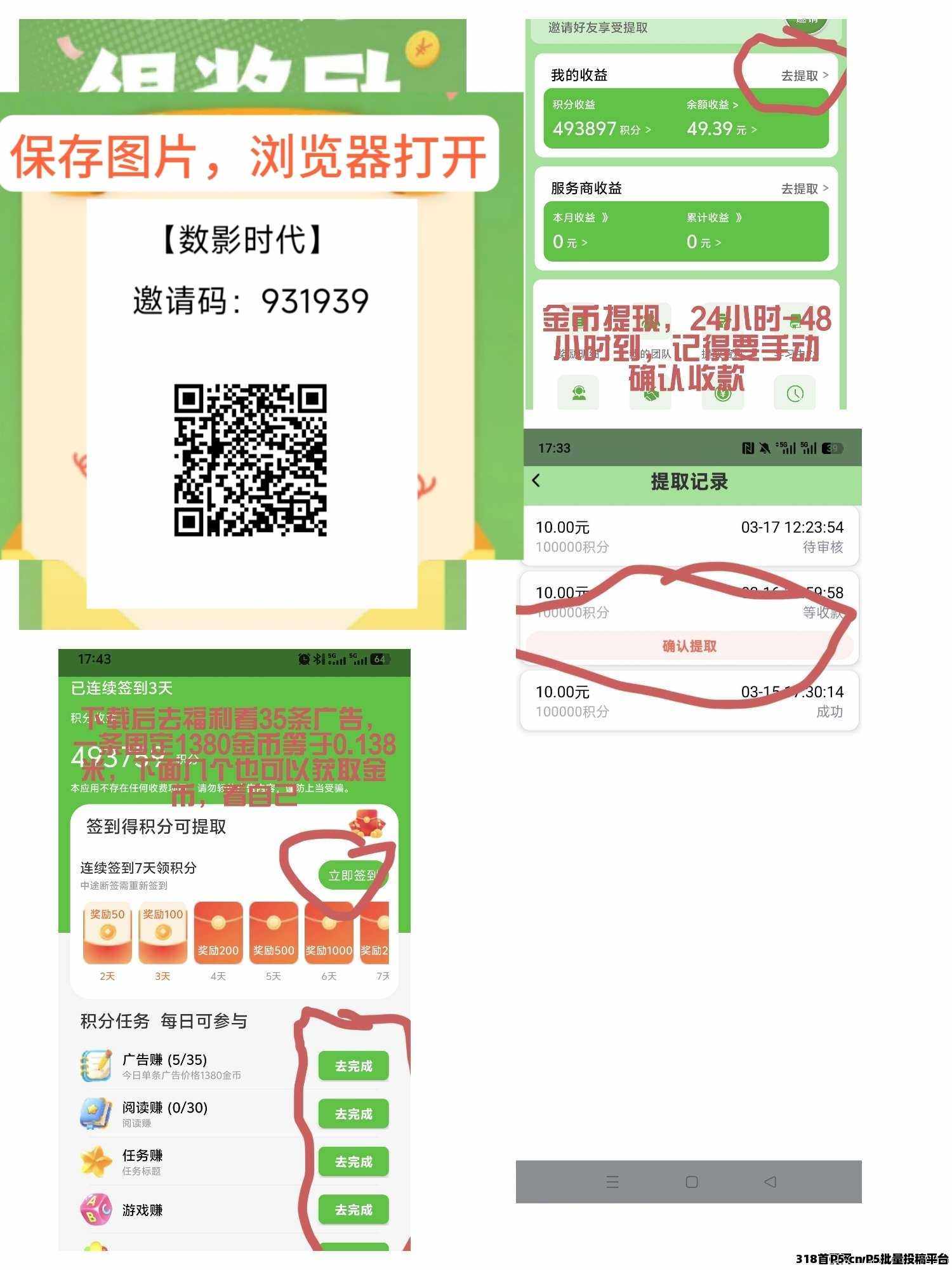 正文 数影时代,固定不养机 ouao00036 V作者 /2026-03-22 12:17:26/175阅读 0322 数影时代 看广告平台,不养机数影时代数影时代邀请码931939新出首码,不用养鸡,0㩕看广告赚,一个广告保底0.138元,日收入5一30元,满1元提现微信支付宝,没有手续费。推广拿 直推10%,间推5%拿团队2%一8%,一机一号一卡,一个网络最多3个设备,单机一天30广告收益5左右,固定不养机数影时代邀请码931939