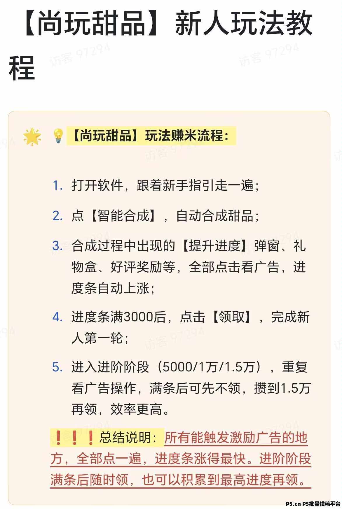 1。打开**,跟着新手指引走一遍;2。点[智能合成],自动合成甜品;3。合成过程中出现的[提升进度]弹窗,礼物盒,好评奖励等,全部点击看广告,进度条自动上涨;4。进度条满3000后,点击[领取],完成新人第一轮;5。进入进阶阶段(5000/1万/1.5万),重复看广告操作,满条后可先不领,攒到1.5万再领,效率更高。!!!总结说明:所有能触发激励广告的地方,全部点一遍,进度条涨得最快。进阶阶段满条后随时领,也可以积累到最高进度再领。🈵1元即可提现!推广收益高,长久稳定