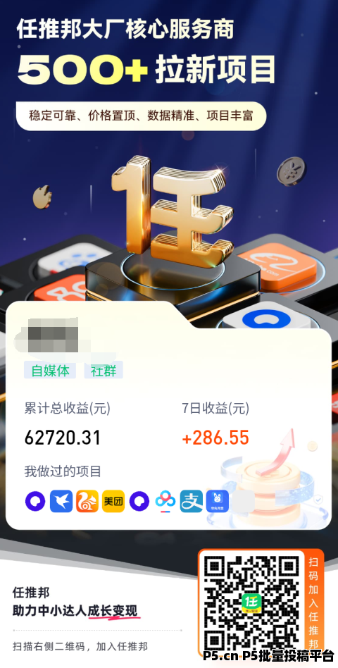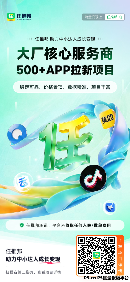 今天给大家分享一个零成本、高回报的副业项目——网盘拉新,用任推邦平台,把日常分享变成持续收入,新手也能轻松上手!为什么网盘拉新是普通人的变现首选?网盘拉新是互联网变现里的“常青树”项目,核心优势太适合中小博主、社群主了:✅ 零门槛,零成本:不需要囤货、不需要押金,平台承诺不收取任何入驻/做单费用,注册就能做✅ 需求刚需,转化简单:不管是分享影视资源、学习资料、**安装包,用户都需要网盘存储,分享链接就能引导拉新✅ 佣金高,结算稳:500+大厂APP拉新项目,网盘类单用户拉新佣金最高几十元,数据精准,收益实时可查✅ 长期可做,被动收益:一次分享,持续有用户点击注册,躺赚被动收入真实收益展示,用数据说话