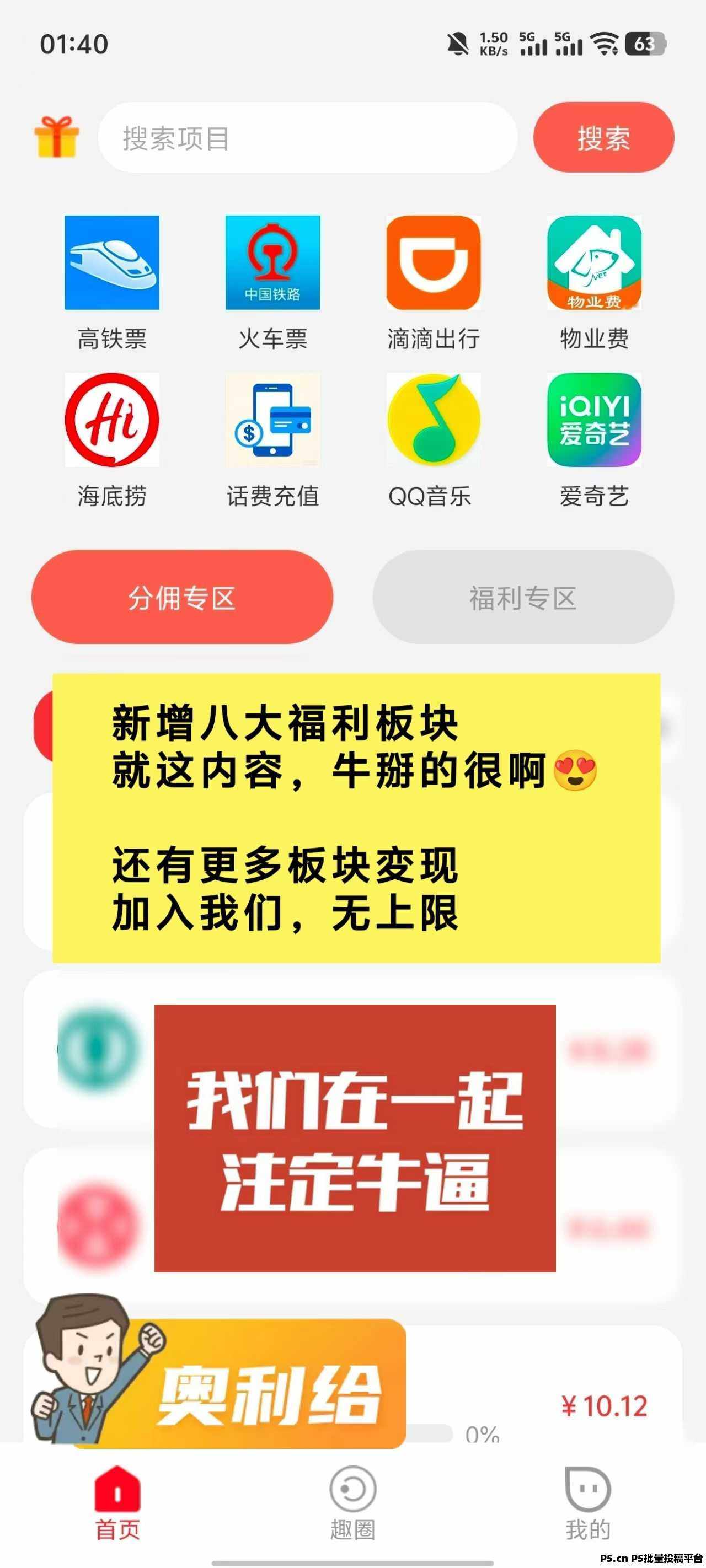4月份全新上线福利版块,注册就能享受话费充值、高铁票、QQ会员、影视会员等,超高折扣,有团队管道收益。