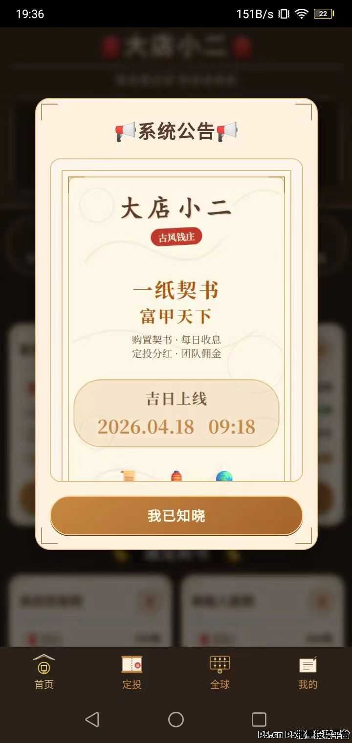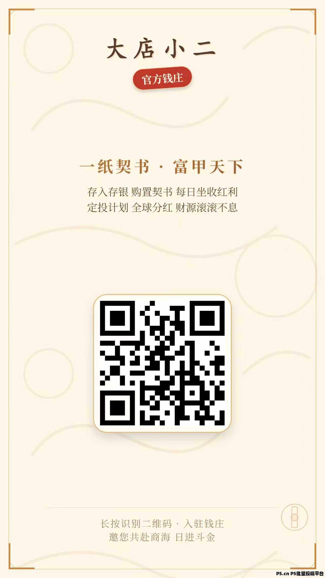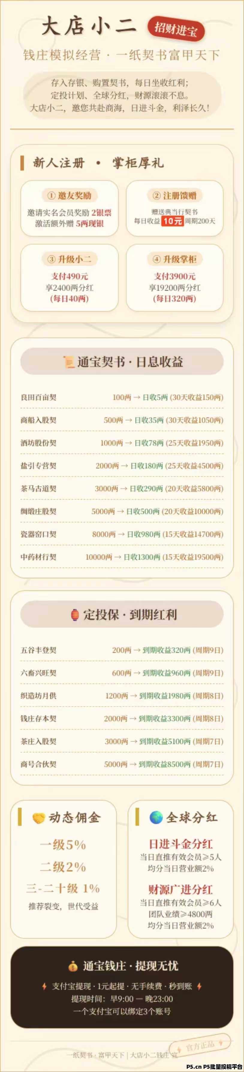 正文 首码,大店小二,注册收益银票 q192390791760003686 V作者 /2026-04-16 21:23:23/127阅读 0416 大店小二:一手内测先机,注册每天收益10元,拉新注册每人2元,快锁粉!首码内测《大店小二》注册送典当行每天收益10银票,每邀请一人注册得2银票,升级店小二每天粉紅40元,升级掌柜每天分紅320元!购置契书每天0点自动收益,定投宝到期出局,推广享受全球团队汾紅,1元起提秒到。【绝对先机速度上车推广锁粉】【18号正式上线开始躺赚收益】
