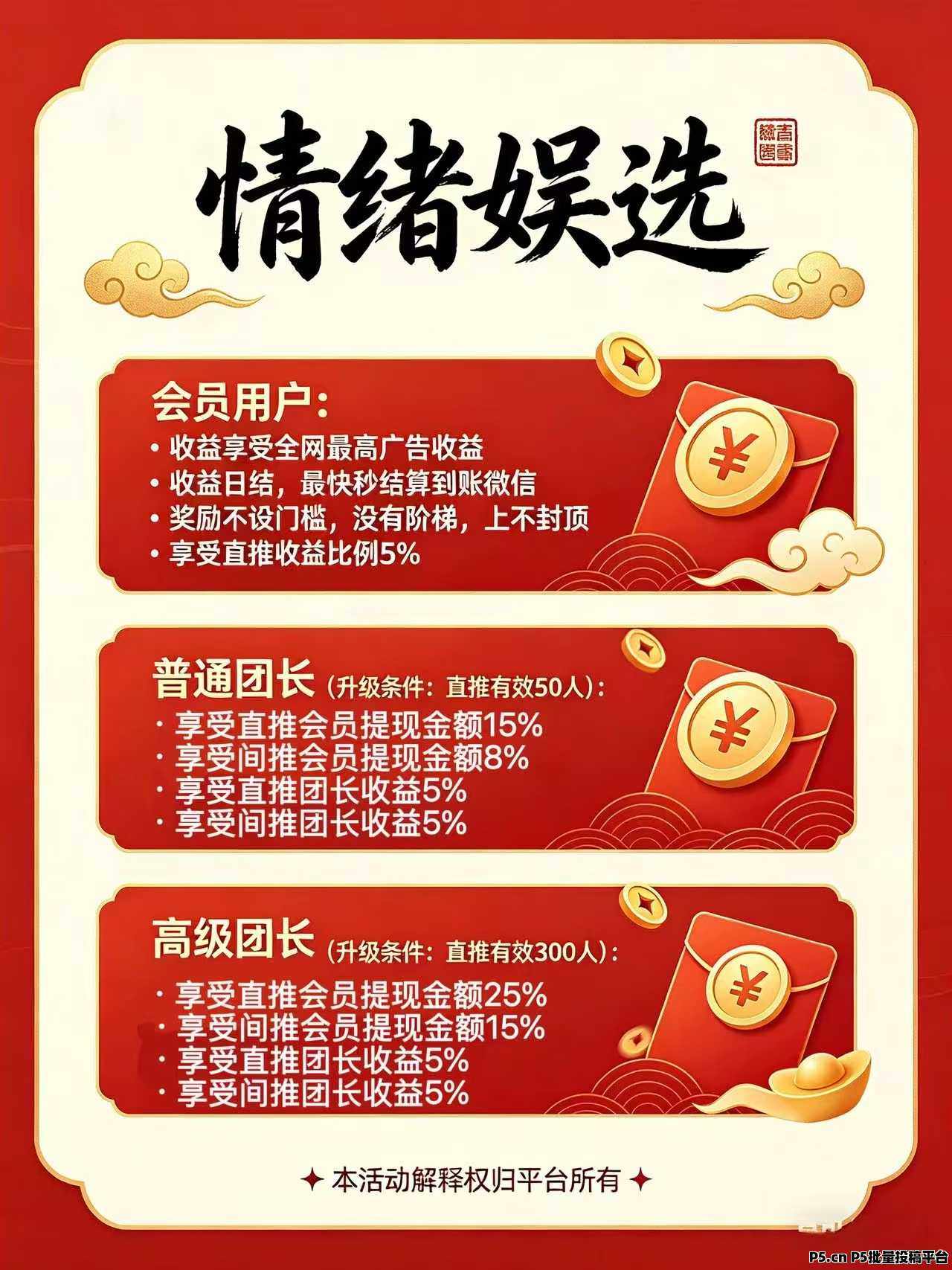 正文 情绪娱选,零撸广告,收益高,新品上线,团队长期高收溢 店流宝000160 V作者 /2026-04-18 11:14:00/75阅读 0418 情绪娱选零撸广告,保底收益高,今日首码新品上线首码今日新出情绪娱选是一款高收溢广告赚米平台,主打零撸模式,无需养机,每日轻松赚取10-50圆服务V:MangGuoMoXiong