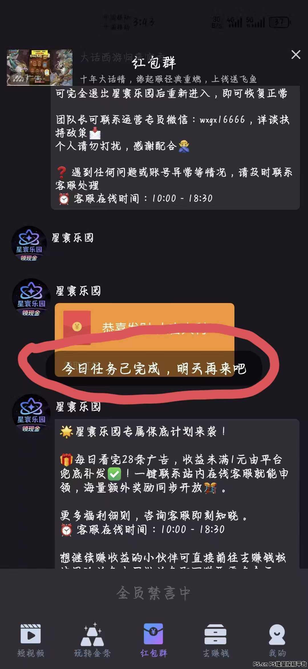 当日红包群广告浏览完成后,收益不足1元,平台全额兜底补发