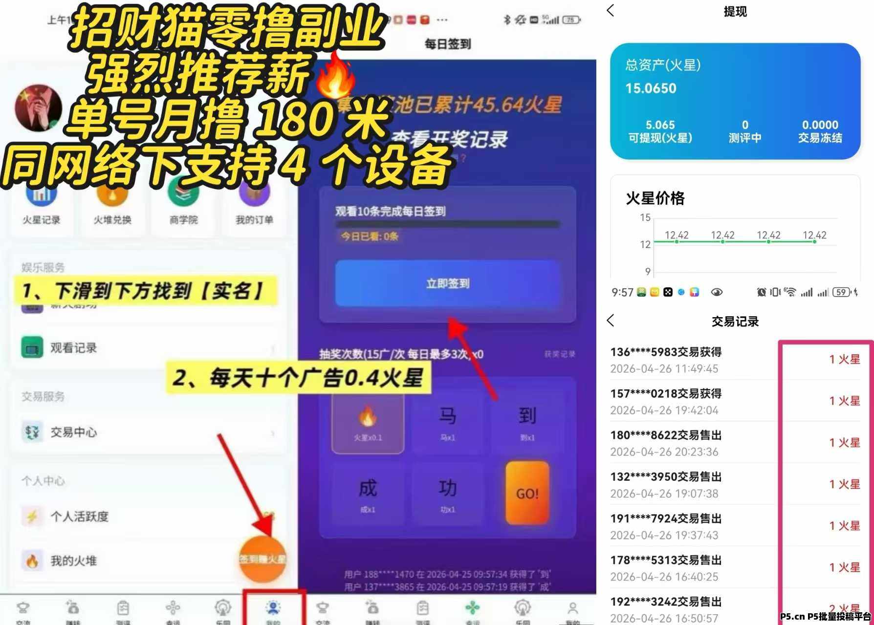 玩法:注册实名然后首页看10个广告得0.4火星价值5元,新用户满5个可以试卖一个,10个以上提现不限制,新用户复投后5个以上部分都可以卖。