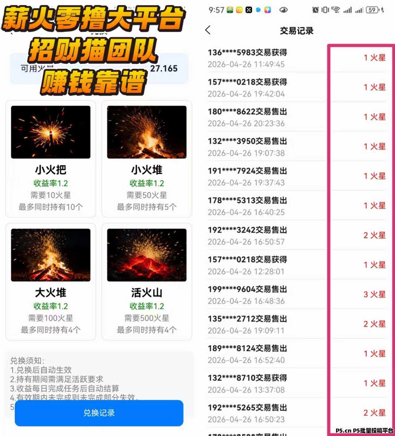 4、之后我们再攒10个去复投一次购买这个小火把,然后这个小伙把我们可以卖产出12个里面的7个,有个几十块钱。满5个以上就能直接去交易市场出售满10个以上可以去平台提现 【同网络下支持4个设备】