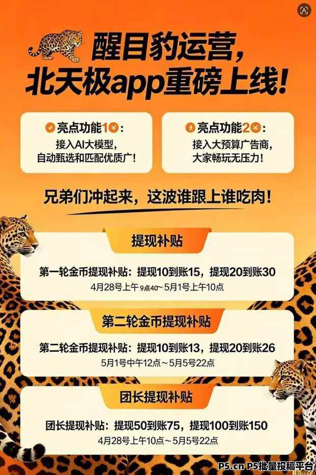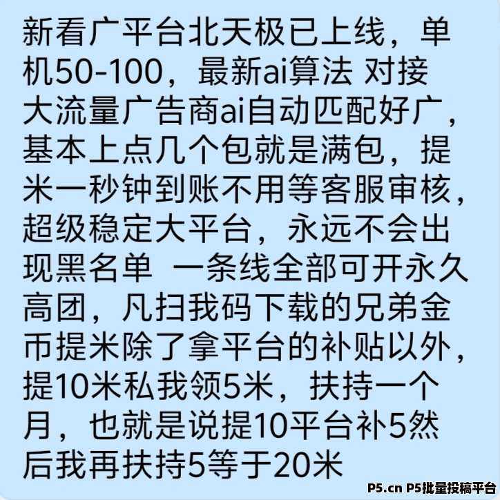 正文 北天极零撸大项目 小成哥哥0002855 V作者 /2026-04-29 20:42:04/49阅读 0429 新看广平台北天极已上线,单机50-100,最新ai算法 对接大流量广告商ai自动匹配好广,基本上点几个包就是满包,提米一秒钟到账不用等客服审核,超级稳定大平台,永远不会出现黑名单 一条线全部可开永久高团,凡扫我码下载的兄弟金币提米除了拿平台的补贴以外,提10米私我领5米,扶持一个月,也就是说提10平台补5然后我再扶持5等于20米
