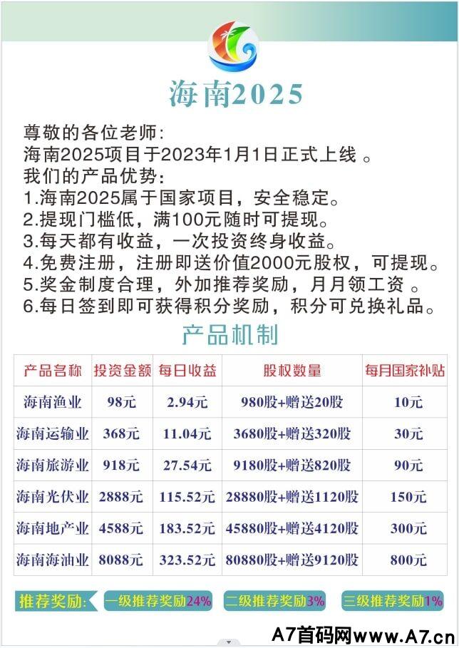 正文 **项目,安全稳定,欢迎全网朋友了解考察 小小7 V评论者 /2022-12-29 05:52:51/3.55 K阅读 1229 **项目—海南2025于2023年1月1日正式上线,敬请期待!我们的产品优势:海南2025属于**项目,安全稳定!提现门槛低,满100元随时可提现!每天都有收益,一次投资终身收益!免费注册,注册即赠送价值2000元股权,可提现!奖金制度合理外加推荐奖励,月月领工资!每日签到即可获得积分奖励,积分可兑换礼品!备注:更多官方信息可以进群了解,欢迎交流考察!