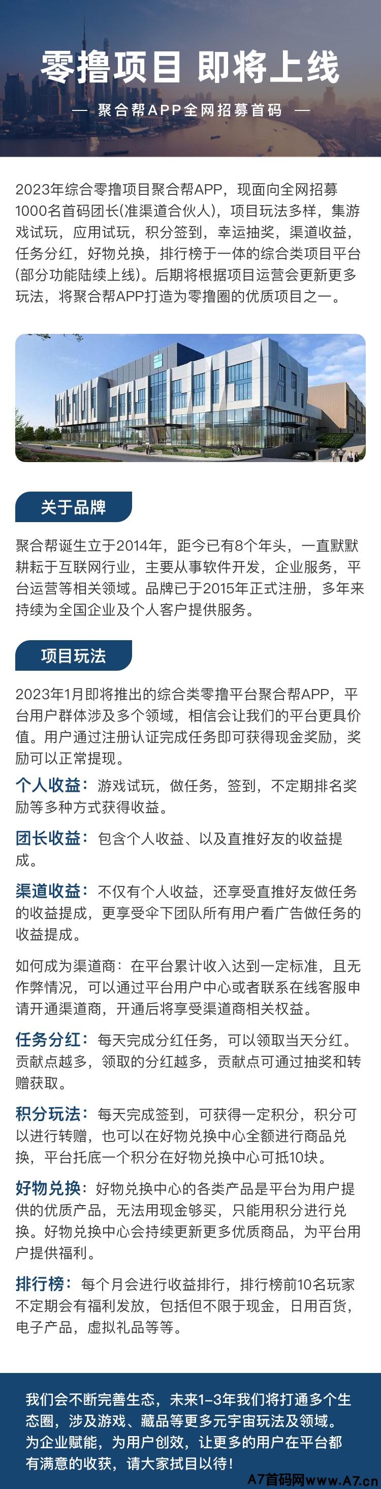 2023年综合项目聚合帮即将上线,现面向全网招募1000名首码团长(准渠道合伙人),项目玩法多样,集游戏试玩,任务试玩,积分签到,幸运抽奖,渠道收益,任务分h,好物兑换,排行榜于一体的综合类项目平台。(部分功能陆续上线)