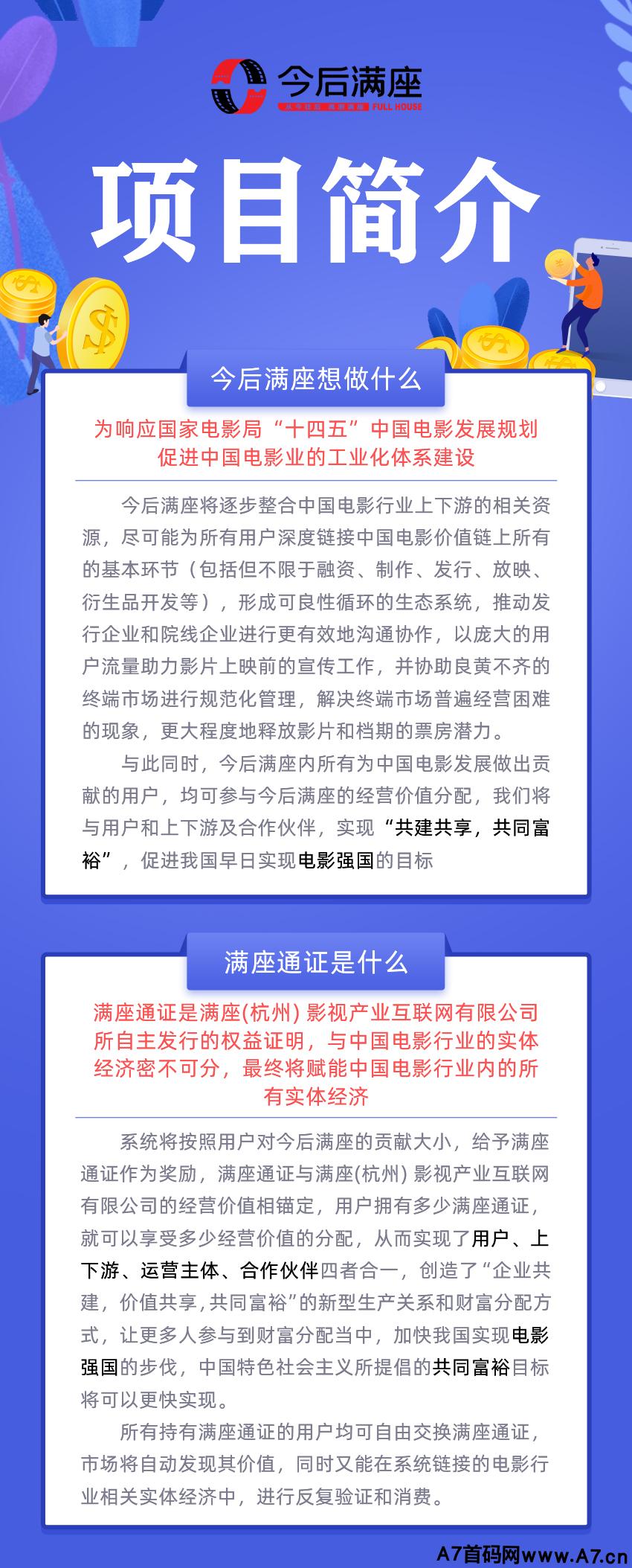 发布防疫优化的宽松政策,标志着我国疫情防控正在向放开的道路逐步迈进,与此同时,也代表着我国电影全产业链的至暗时刻即将结束。为积极响应**电影局的号召,推动中国电影行业在至暗时刻结束后的进一步发展,早日达成电影强国的目标。满座通证是满座(杭州)影视产业互联网有限公司所自主发行的权益证明,与中国电影行业的实体经济密不可分,最终将赋能中国电影行业内的所有实体经济。系统将按照用户对今后满座的贡献大小,给予满座通证作为奖励,满座通证与满座(杭州)影视产业互联网有限公司的经营价值相锚定,用户拥有多少满座通证,就可以享受多少经营价值的分配,从而实现了用户、上下游、运营主体、合作伙伴四者合一,创造了“企业共建,价值共享,共同富裕”的新型生产关系和财富分配方式,让更多人参与到财富分配当中,加快我国实现电影强国的步伐,中国特色社会主义所提倡的共同富裕目标将可以更快实现。所有持有满座通证的用户均可自由交换满座通证,市场将自动发现其价值,同时又能在系统链接的电影行业相关实体经济中,进行反复验证和消费。1.所有实体通道收入2.所有票务销售收入3.定期行业政策补贴4.巨大流量广告收入5.其他合作通道收入6.影视周边商城收入7.线下影城加盟收入8.合作流媒体收入9.合作商家收入10.合作品牌收入等等...