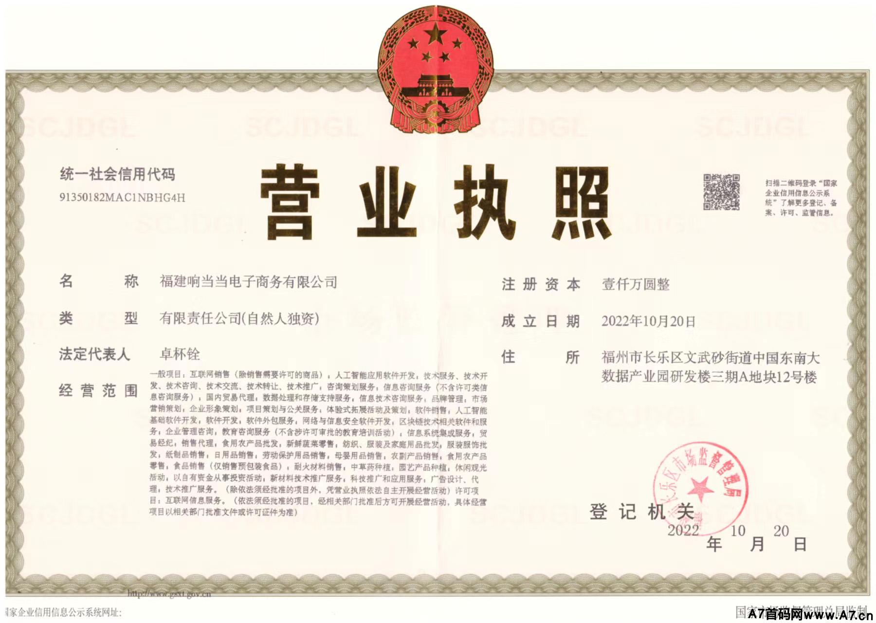 《福建响当当电子商务有限公司》于2022年10月20 8注册成立在福州市长乐区文武砂街道中国东南大数据产业园研发楼三期A地块12号楼。