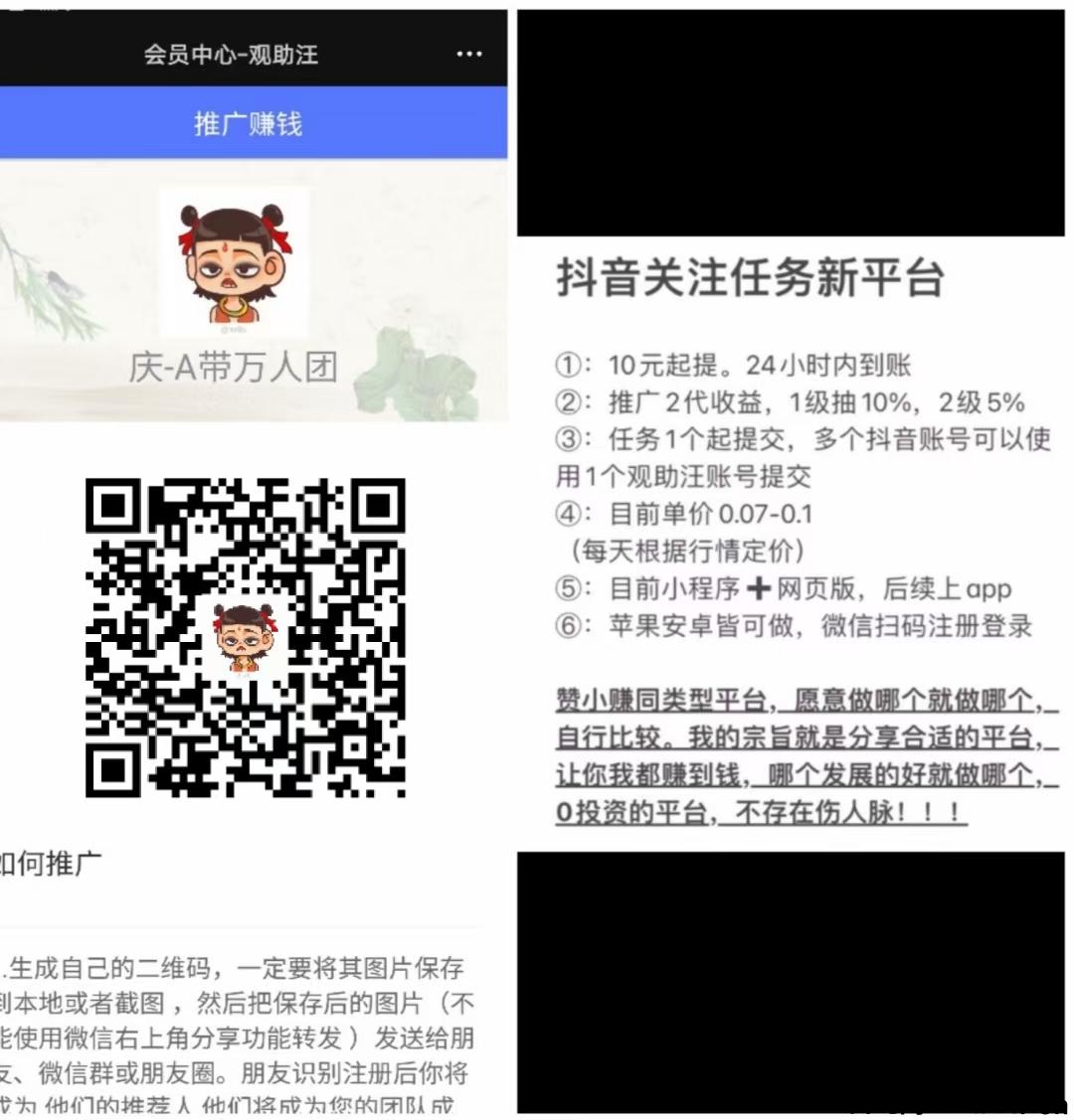 正文 观助汪,刚出来的抖y关注项目,早占位早吃肉 海哥 V评论者 /2023-02-02 16:46:33/4.11 K阅读 0202 观助汪是一款新出的抖音关注赚钱平台,此款平台现阶段算的上是全网最高单价的平台了,在此款平台中每个关注单价0.9元-1.1元,并且平台29号就会上线任务,任务会每日更新,平台号称单抖音账号每日收益就可以达到20+,抖音账号越多,每日获得的收益也就越高,任务操作也是非常简单的,没做任务之前截图一下,任务完成后截图一下,然后上传就行了。1.微信扫描下方二维码进行注册下载。QQ群: 626702322