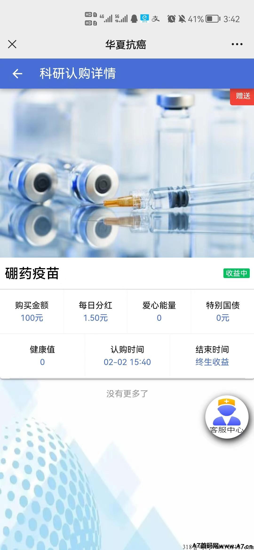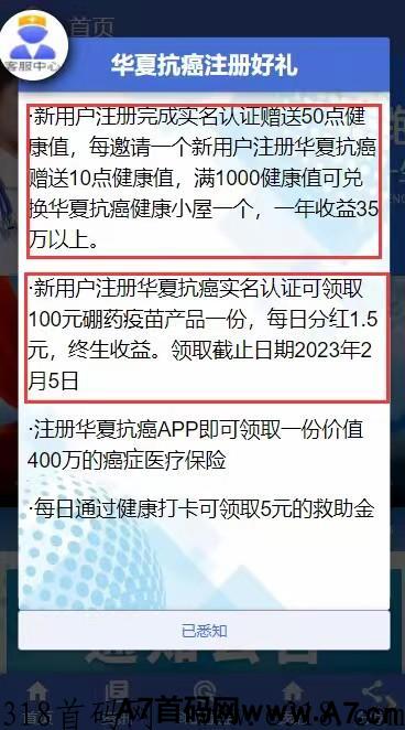 福利一:新用户注册**抗癌APP实名认证可领取100元硼药疫苗产品一份,每日分h1.5元,终生收益。领取截止日期2023年2月5日