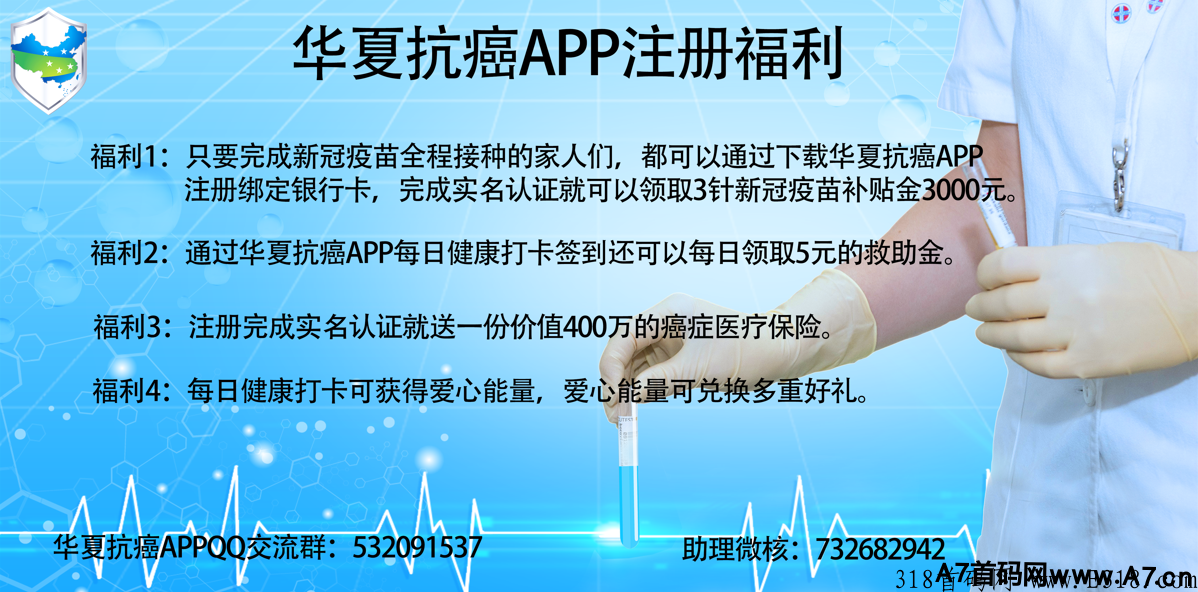 福利1:只要完成新冠疫苗全程接种的家人们,都可以通过下载**抗癌APP注册绑卡,完成实名认证就可以领取补贴金3000元。