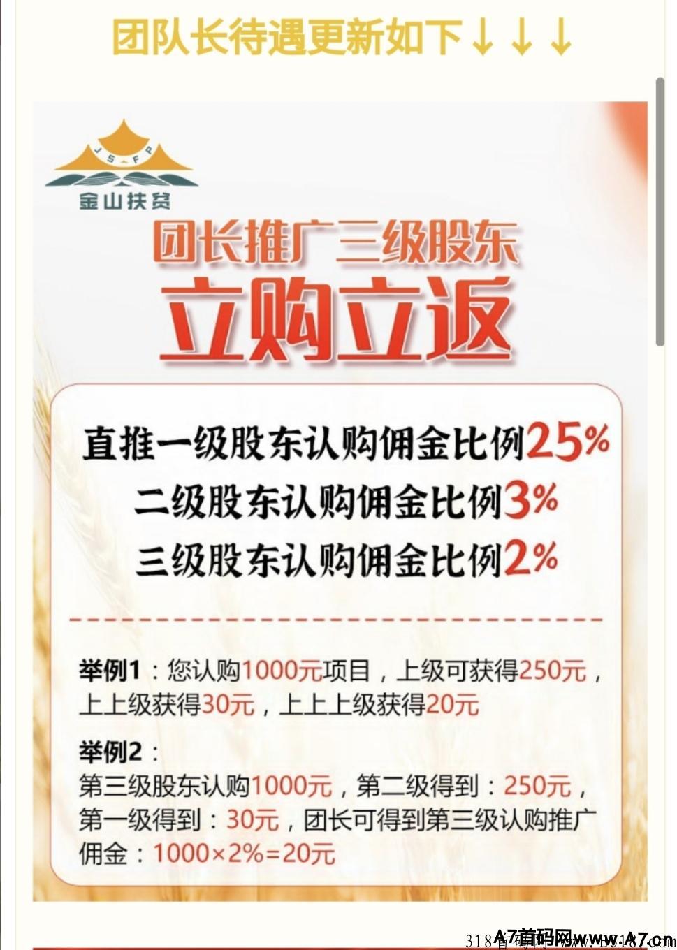 举例1 :您认购1000元项目,上级可获得250元,. 上上级获得30元,上上上级获得20元是!