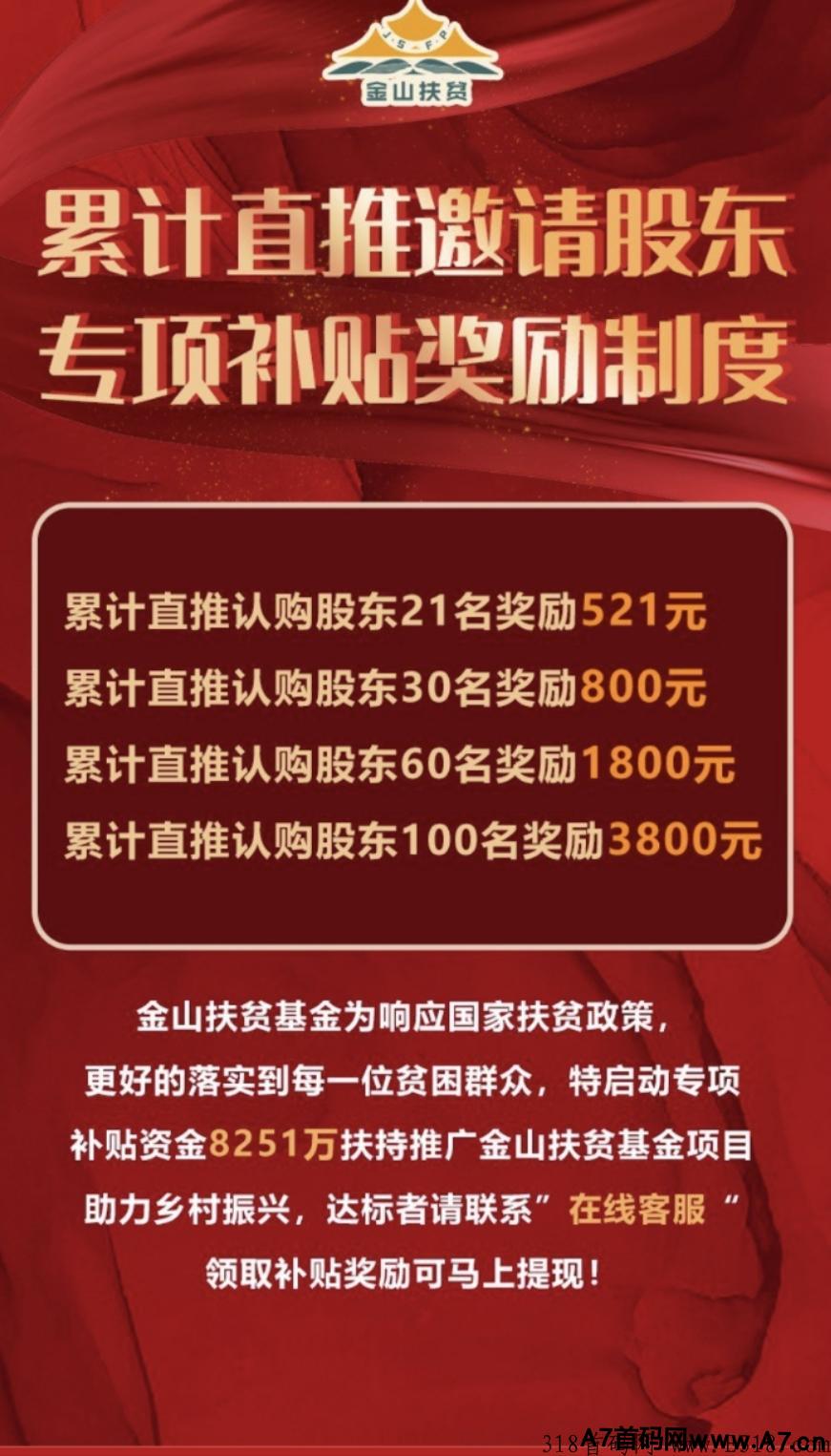 更好的落实到每一位贫困群众,特启动专项补贴资金8251万扶持推广金山**基金项目助力乡村振兴,达标者请联系”在线客服
