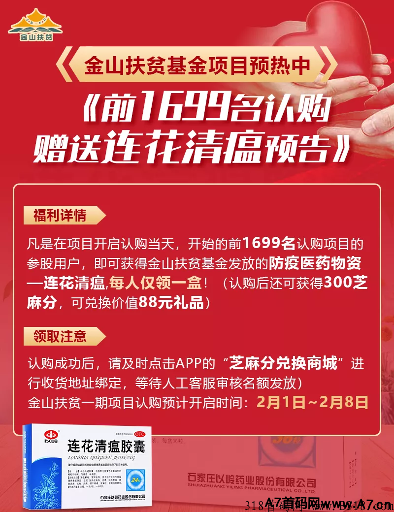 7,今日认购前1699名可获得连花清瘟,认购之后只需要在芝麻分兑换礼品中绑定你的收货地址,平台会根据前1699名自动发货,无需联系任何人领取
