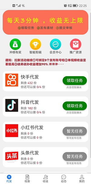 直接识别二维码进入,点击代发,可以看到快手小红书的视频代发任务!