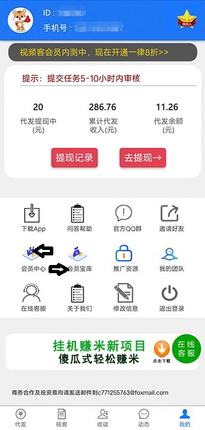 点击,我的,会员中心,可以付费开通会员,虽然能提高做任务数量和收益(看下图别人的收益图),但个人不建议,即使平台还有会员宝库一堆教程可供学习,但目前来说依靠那些教程想要赚钱很难,很多人也是经常用那些教程,在网上忽悠别人付费学习,寻味在此特意提出也是避免大家冲动,先去实际了解一下代发视频收益再考虑,毕竟赚钱不易再被当做韭菜割就不好了!