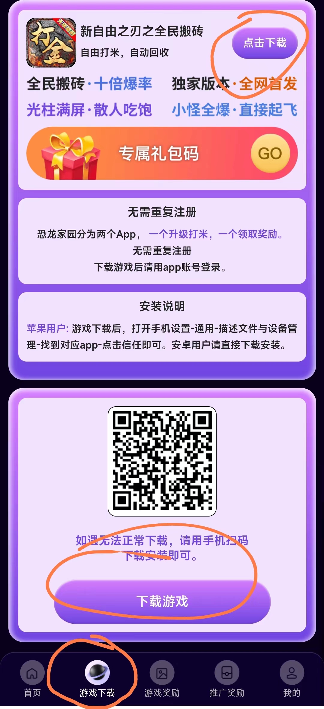 第二步:下载恐龙家园之自由之刃传奇手游,恐龙家园app用于装备收回的,自由之刃app是手游。不需要重复注册,账号密码一样。