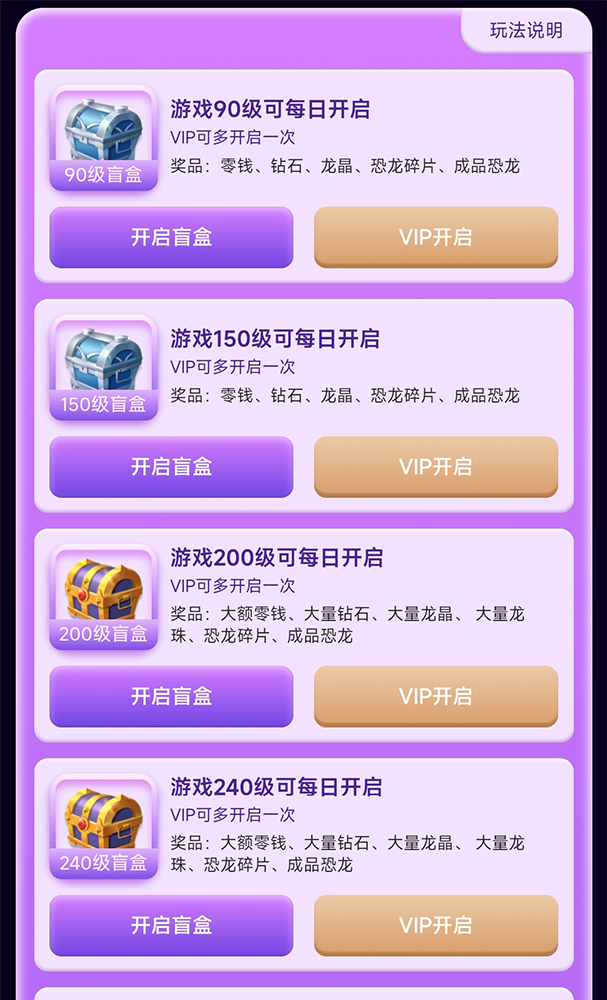 3恐龙家园之自由之刃传奇手游等级盲盒奖励,90级、150级、200级、240级、280级、320级、350级、380级、400级、420级、440级、460级、480级、500级都可以开启盲盒。