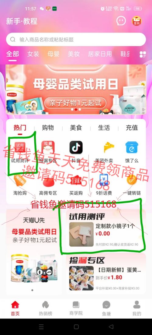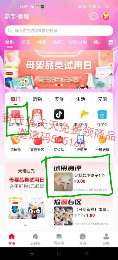 1、扫码下载APP登录后,填写邀请码:515168(不然无法领取试用商品)然后点击首页的“试用测评”