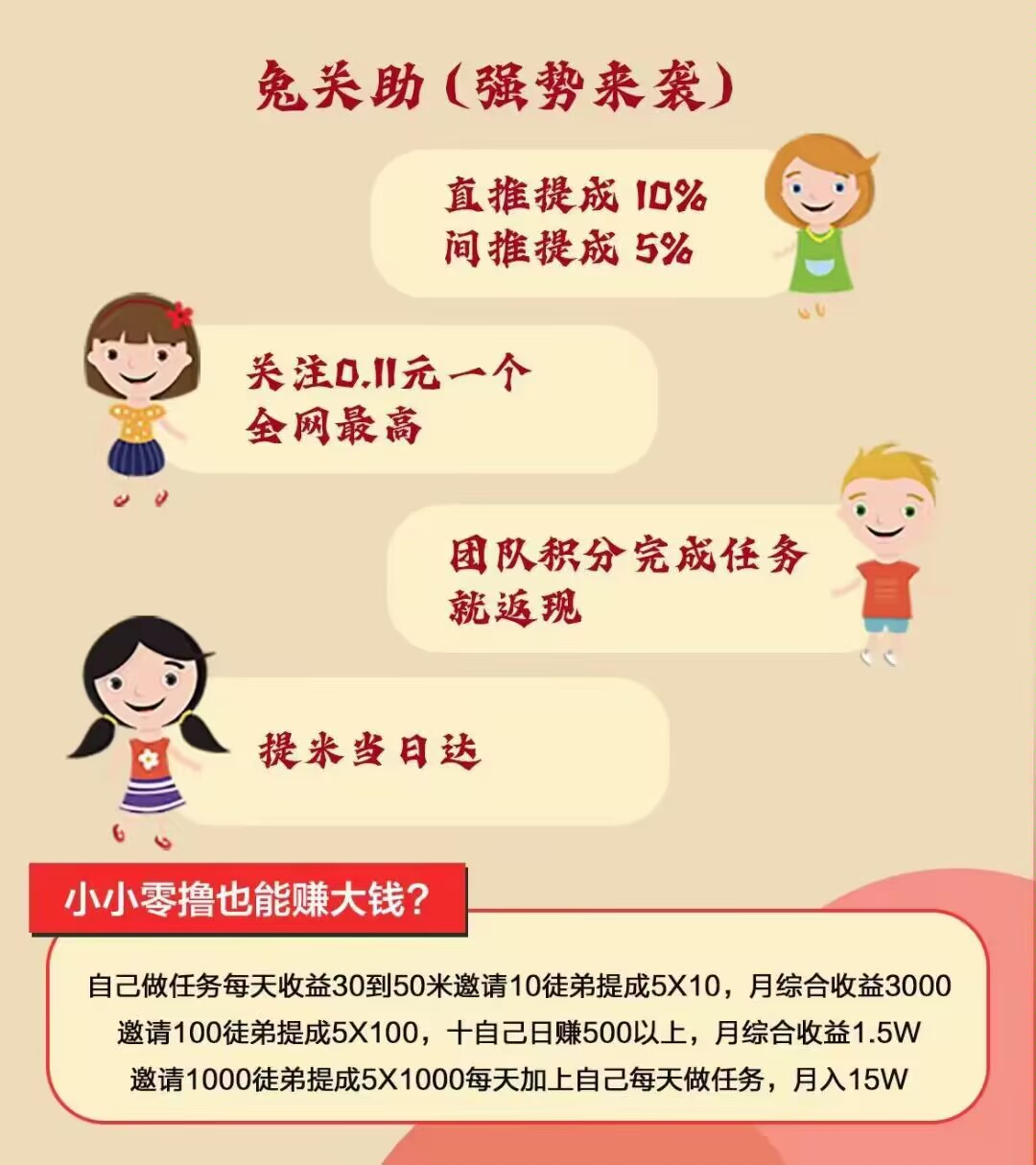 正文 兔观助刚出一秒 海哥 V评论者 /2023-02-14 15:27:19/2.66 K阅读 0214 刚上线一秒《兔关助》必须v扫码一款抖关注赚米平台,全网最高单价0.11,一个也能提交提米当天到米苹果安卓V信扫码都可以玩日撸20米+抖关注,多号多做,多提交官方群实时处理问题永不禁言两代收益无上限,二代收益,一代10%,二代5%团队长直推100,团队1000,每日上榜享受公司百分之50%提成**平台上有官方群必进,了解实时**上线一周后续上抖点赞,抖评论,快关注,达到一个0撸50+0门槛项目速度扫码锁粉