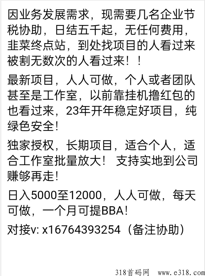 正文 百万项目,企业协助 百万项目 V评论者 /2023-02-18 16:18:19/1.85 K阅读 0218 韭菜终点站,到处找项目的人看过来 被割无数次的人看过来!!最新项目,人人可做,个人或者团队甚至是工作室,以前靠的也看过来,23年开年稳定好项目,纯绿色安全!独家授权,长期项目,适合个人,适合工作室批量放大! 一个月可提BBA!对接v : x16764393254